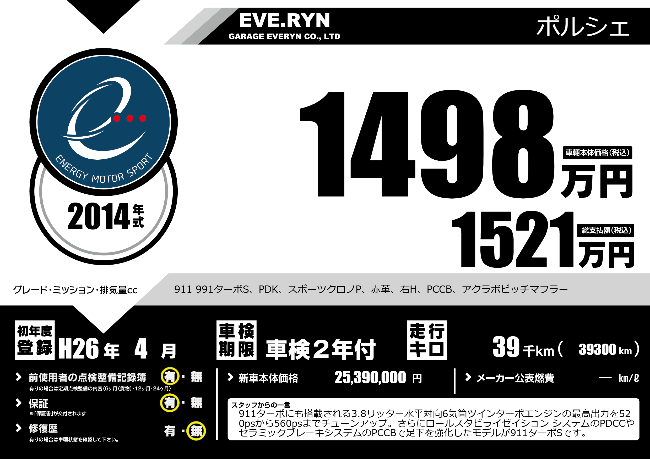 911 991ターボS、PDK、スポーツクロノP、赤革、右H、PCCB、アクラボビッチマフラー |