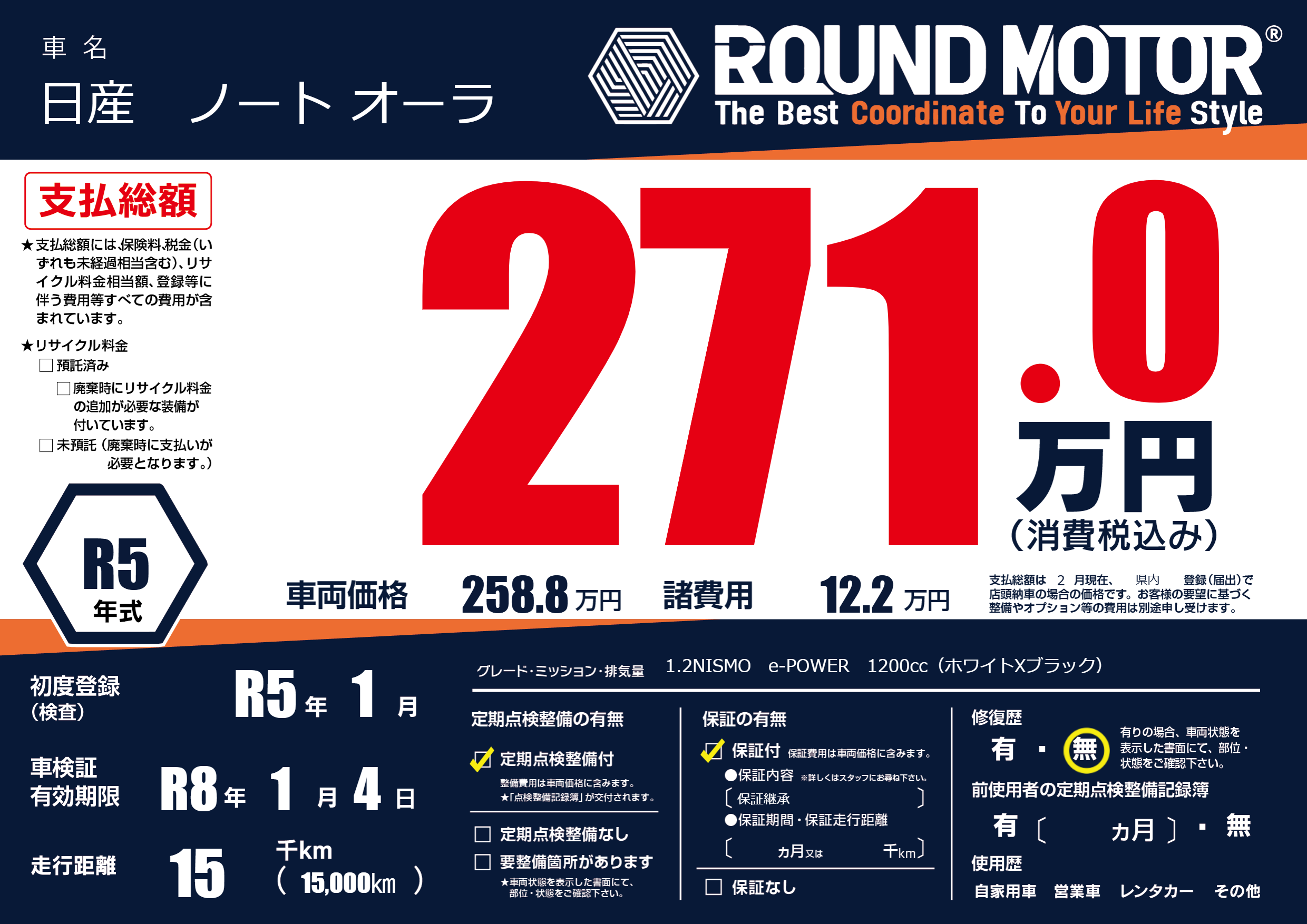 | 車名 | 日産 ノート オーラ | グレード ミッション 排気量 |