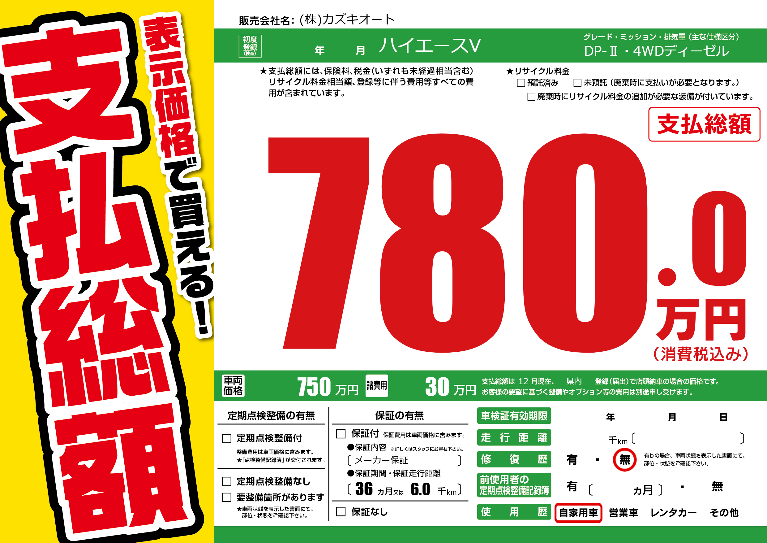 | 車名 | ハイエースV | グレード ミッション 排気量 |