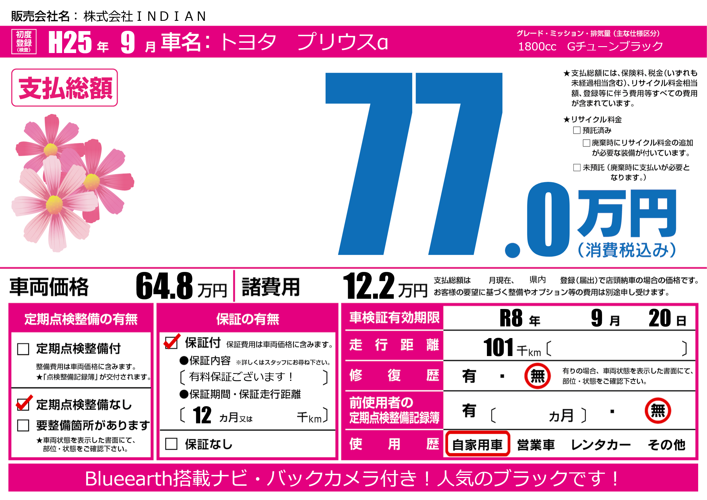 | 車名 | トヨタ プリウスα | グレード ミッション 排気量 |