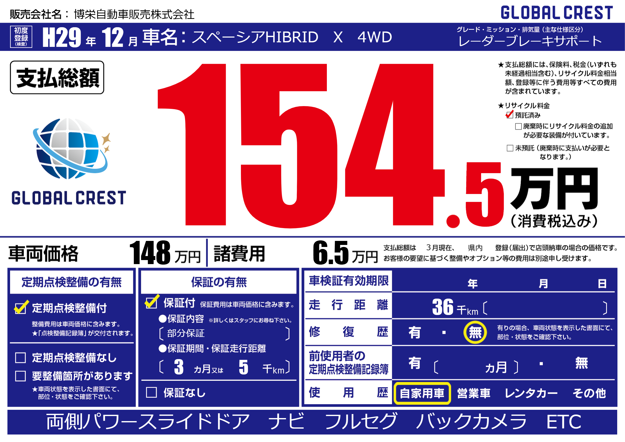 | 車名 | スペーシアHIBRID X 4WD | グレード ミッション 排気量 |