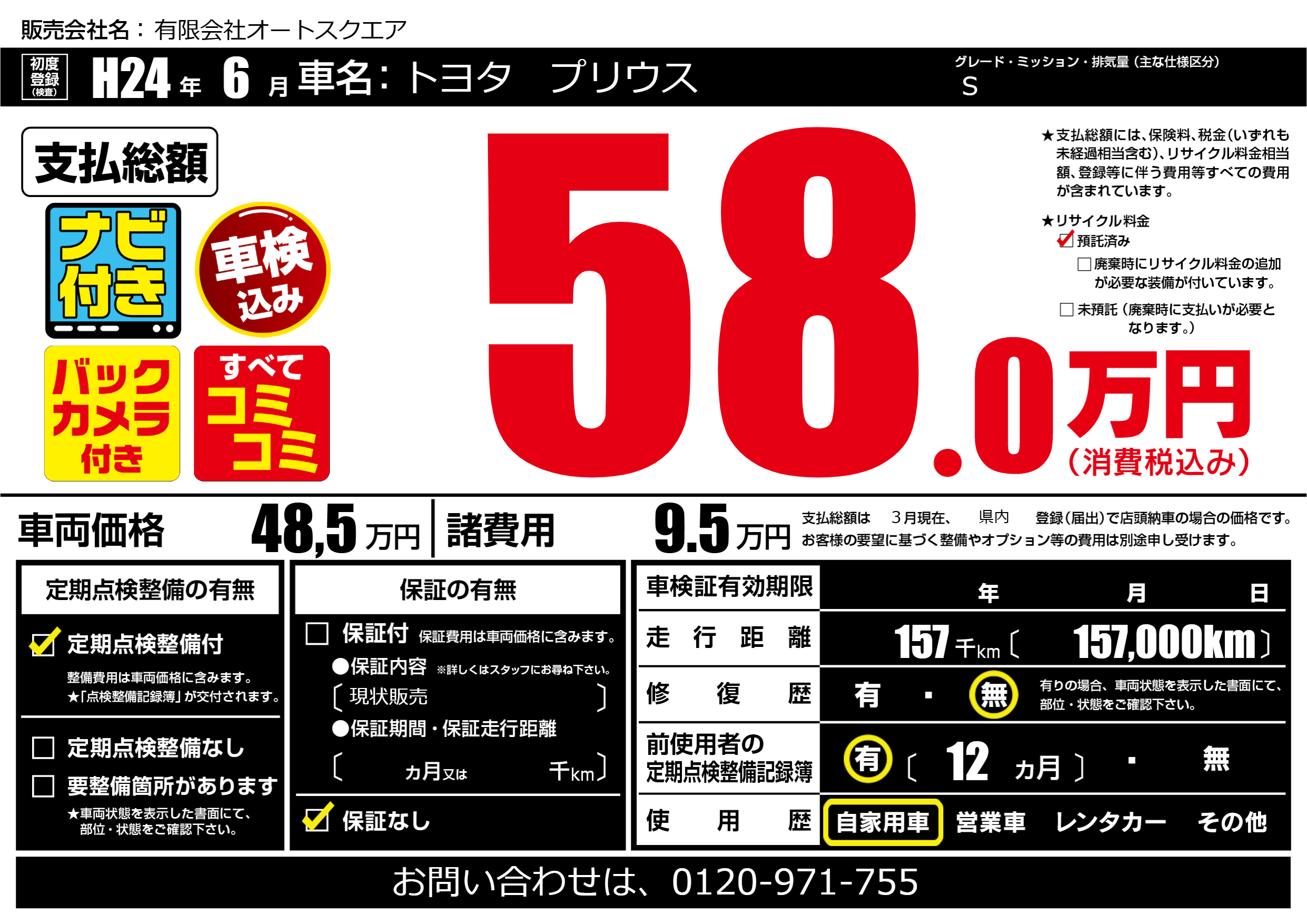 | 走行キロ | 15.7万km | 初年度登録 | H24年6月 |
