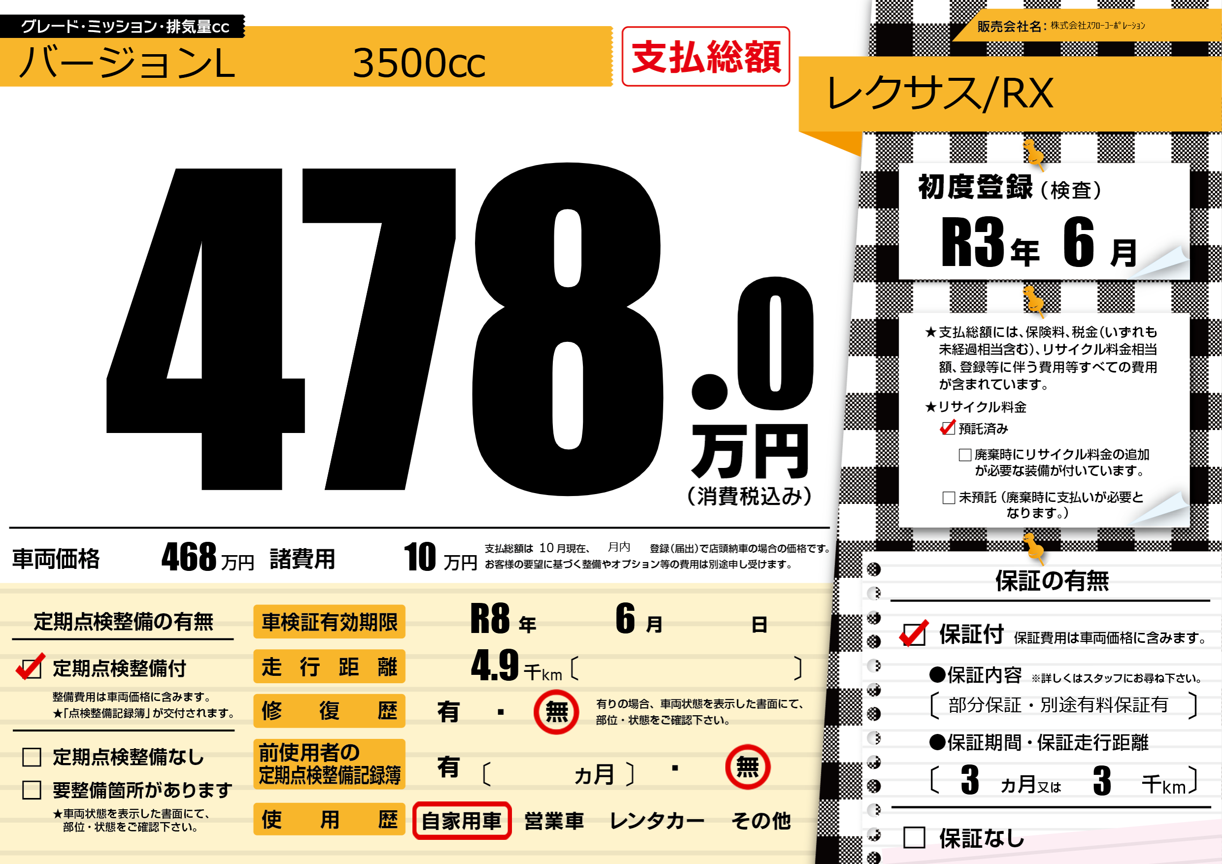| 車名 | レクサス/RX | グレード ミッション 排気量 |
