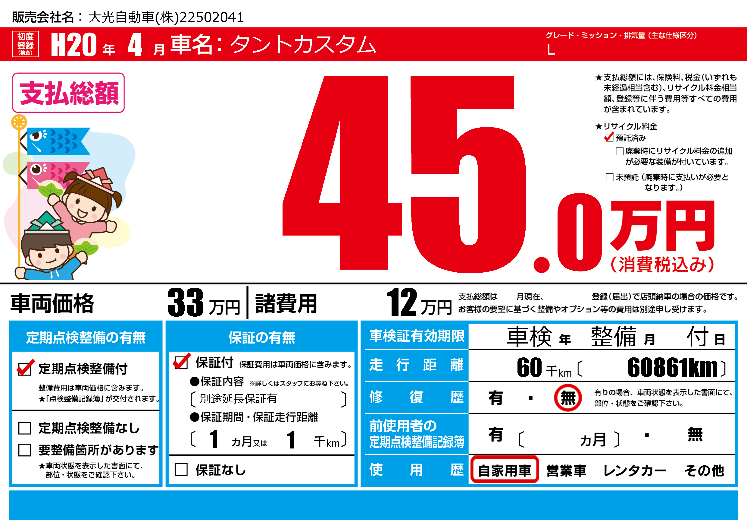 | 走行キロ | 6万km | 初年度登録 | H20年4月 |