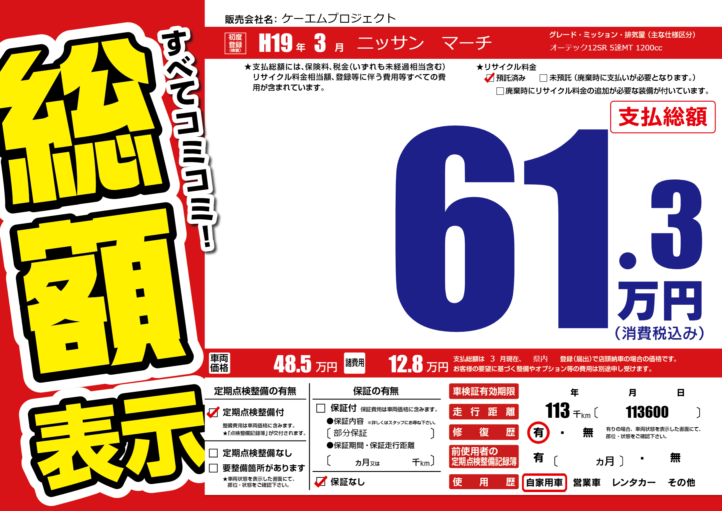 | 車名 | ニッサン マーチ | グレード ミッション 排気量 |