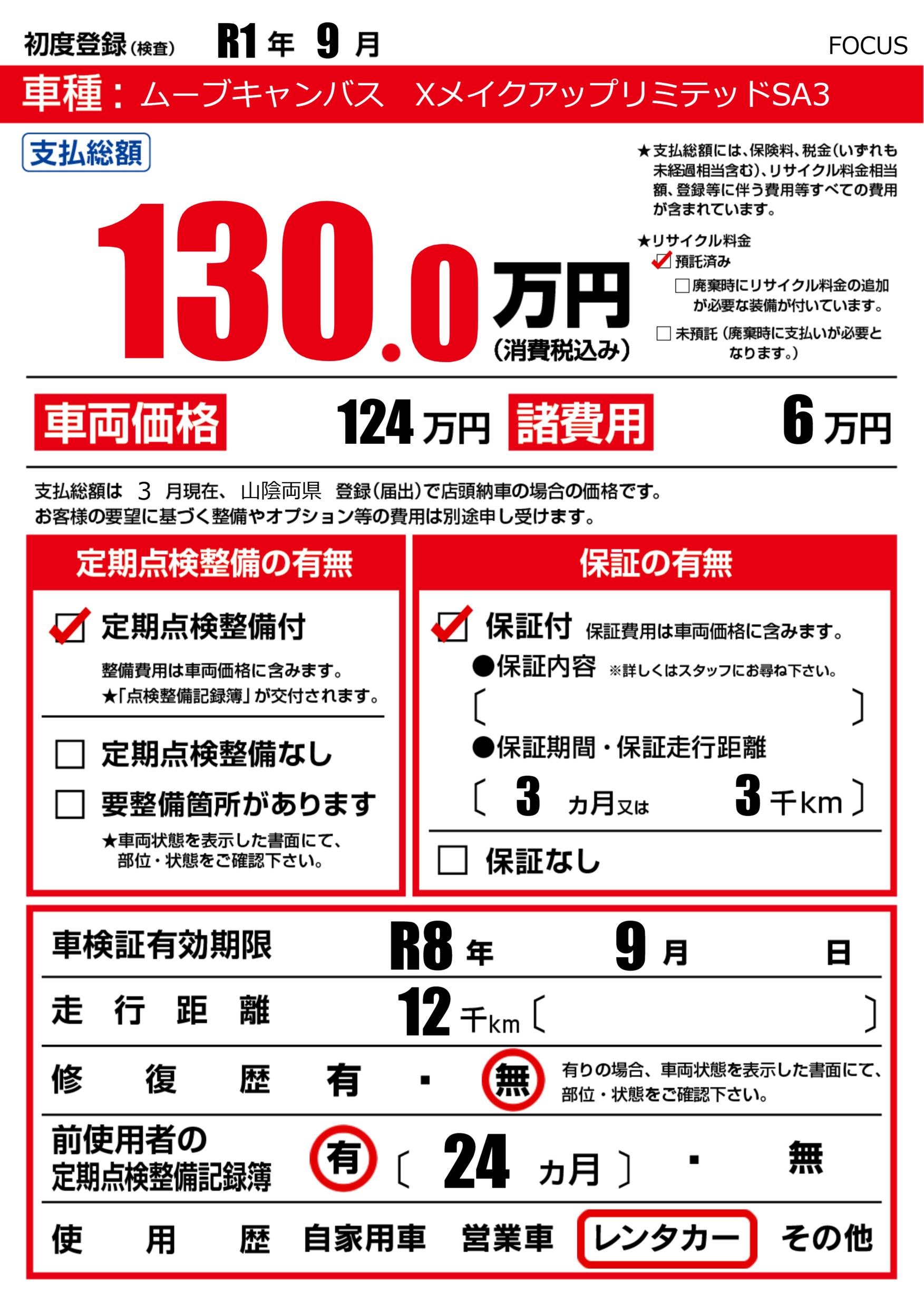 | 走行キロ | 1.2万km | 初年度登録 | R1年9月 |