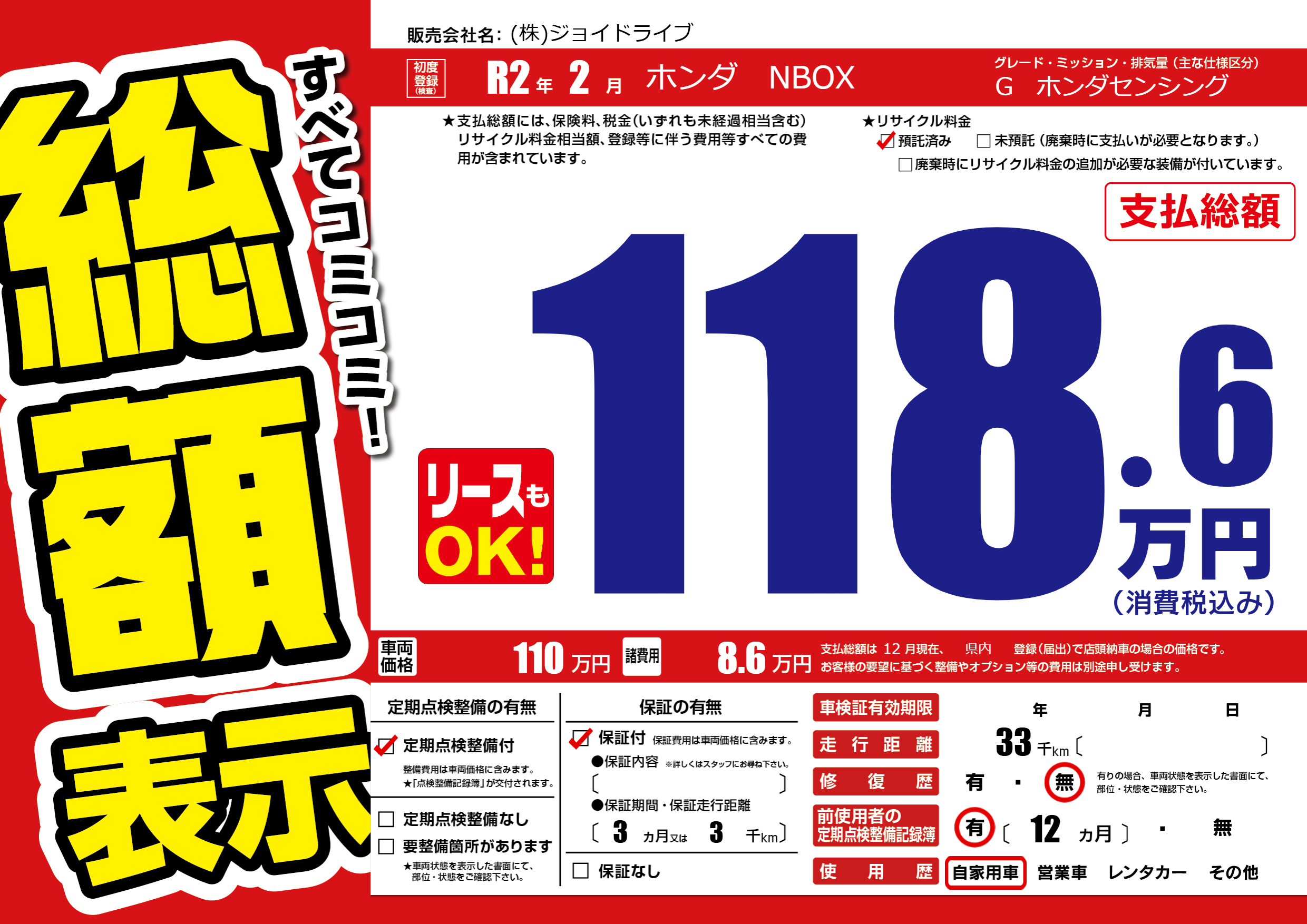 保証付き 保証内容(---) 3ヶ月または(3)千kmまで |