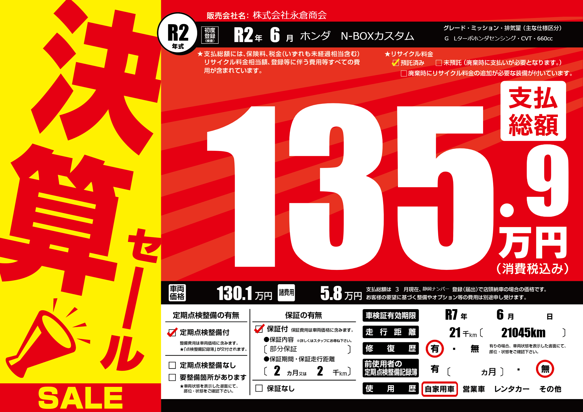 | 車検制限 | R7年 6月 - 日 | ||