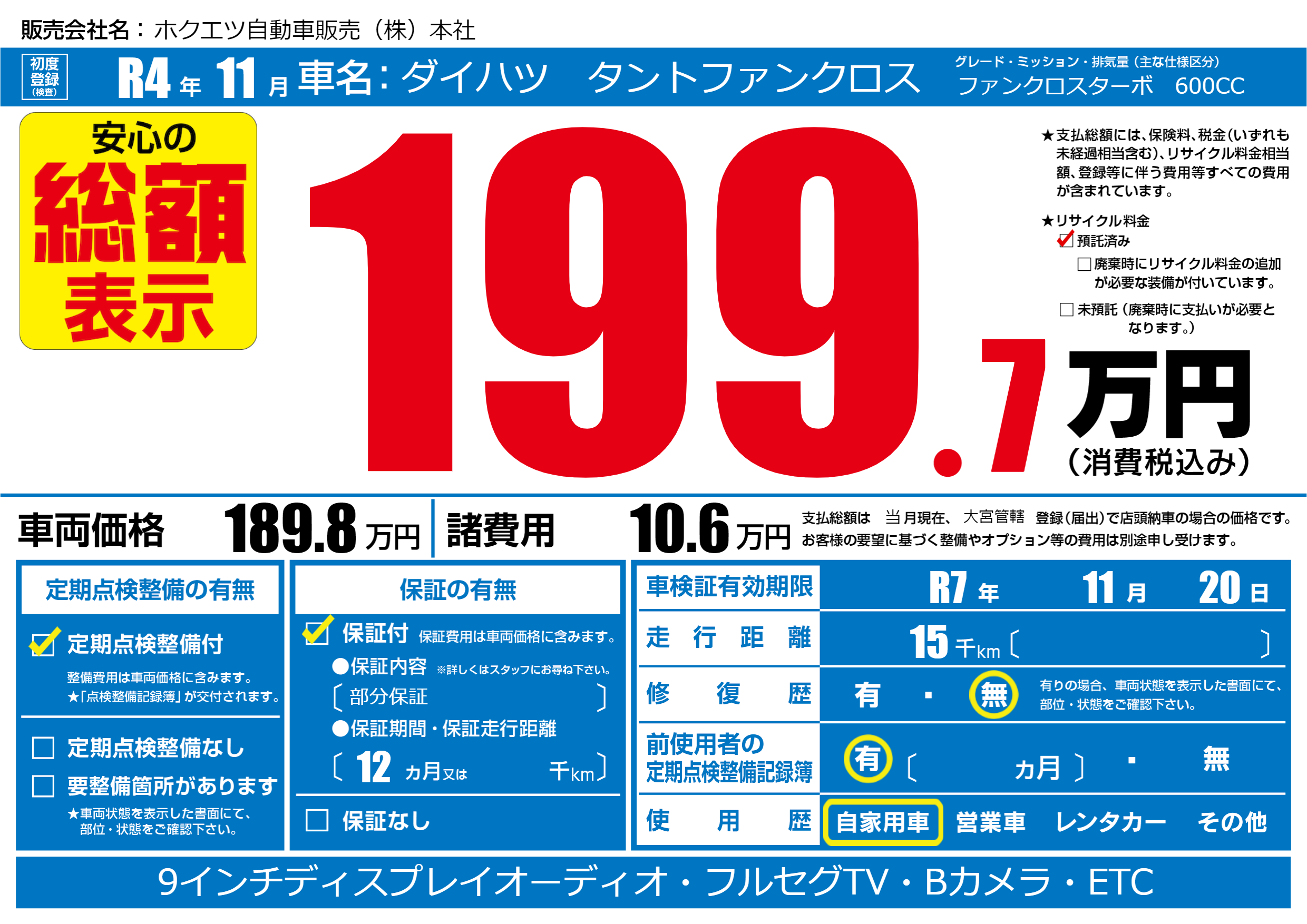| 車名 | ダイハツ タントファンクロス | グレード ミッション 排気量 |