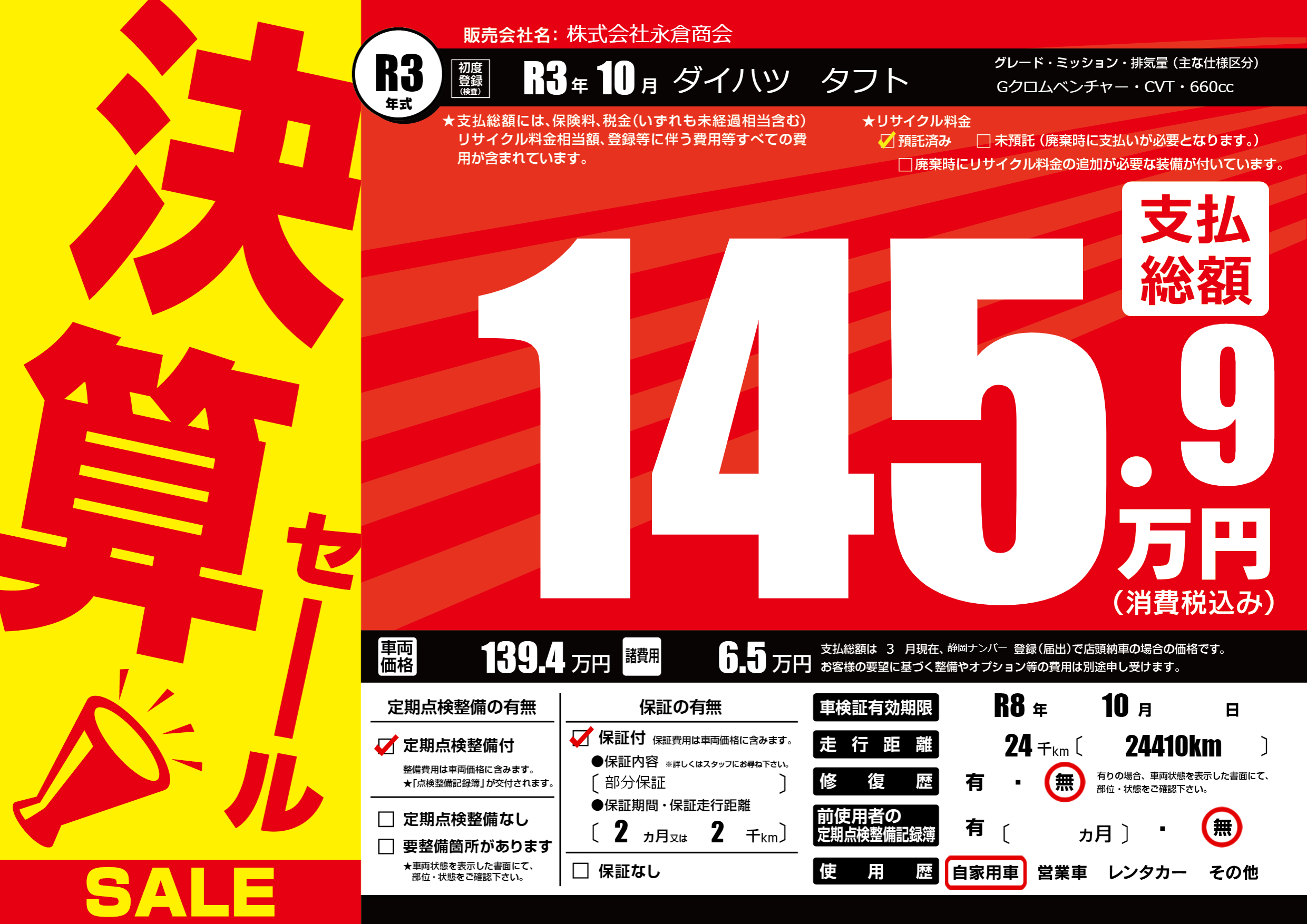 | 走行キロ | 2.4万km | 初年度登録 | R3年10月 |