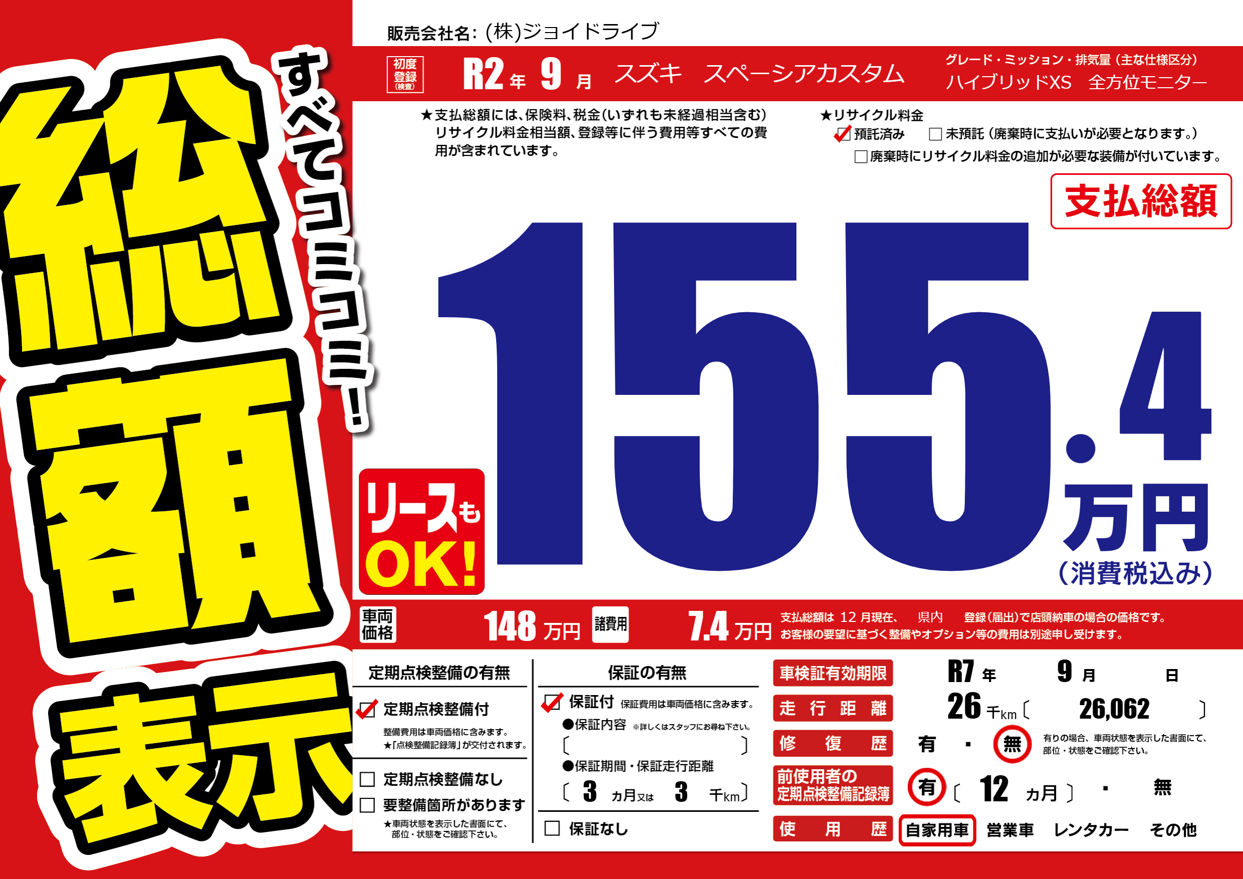 | 車名 | スズキ スペーシアカスタム | グレード ミッション 排気量 |