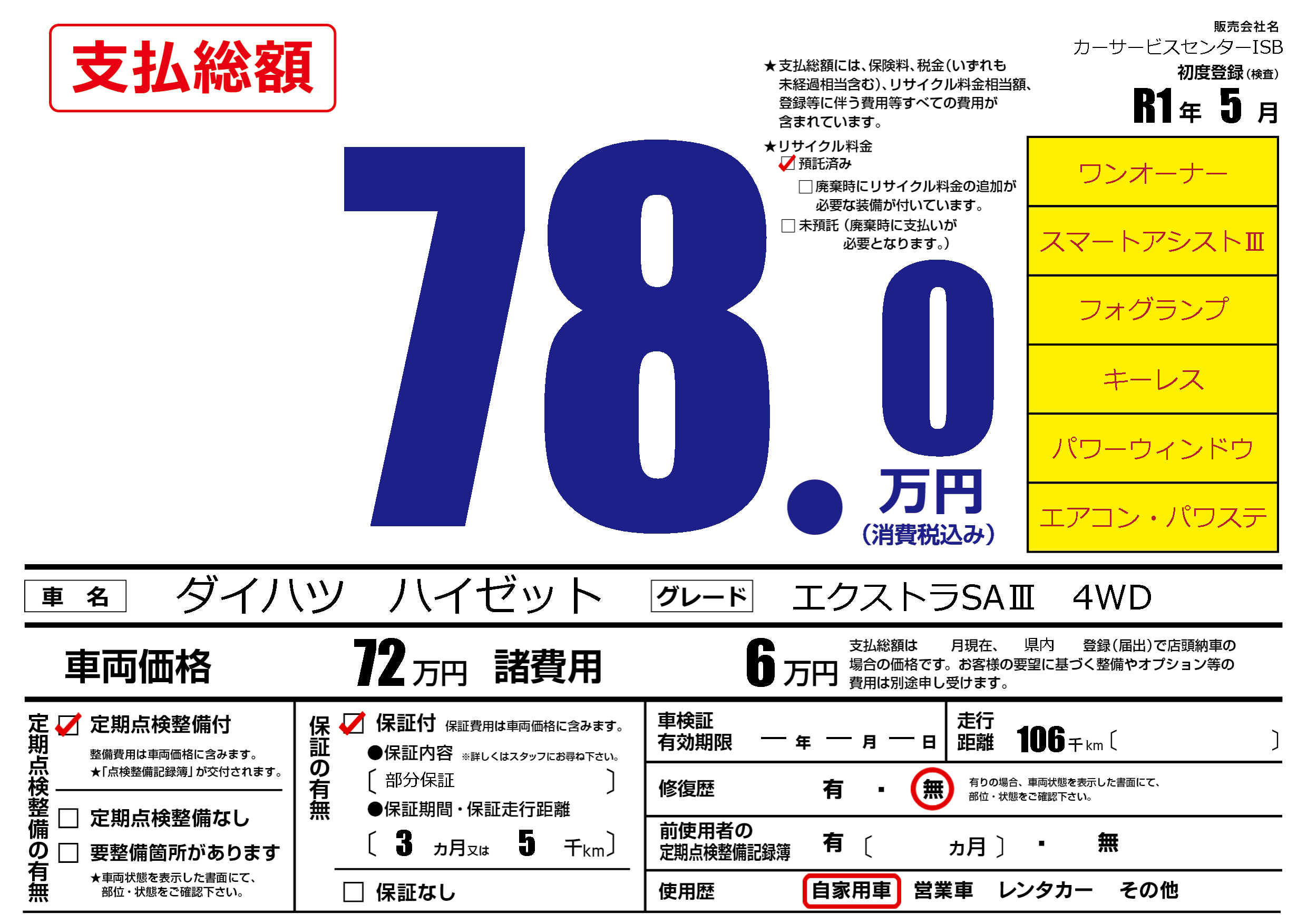 保証付き 保証内容(部分保証) 3ヶ月または(5)千kmまで |