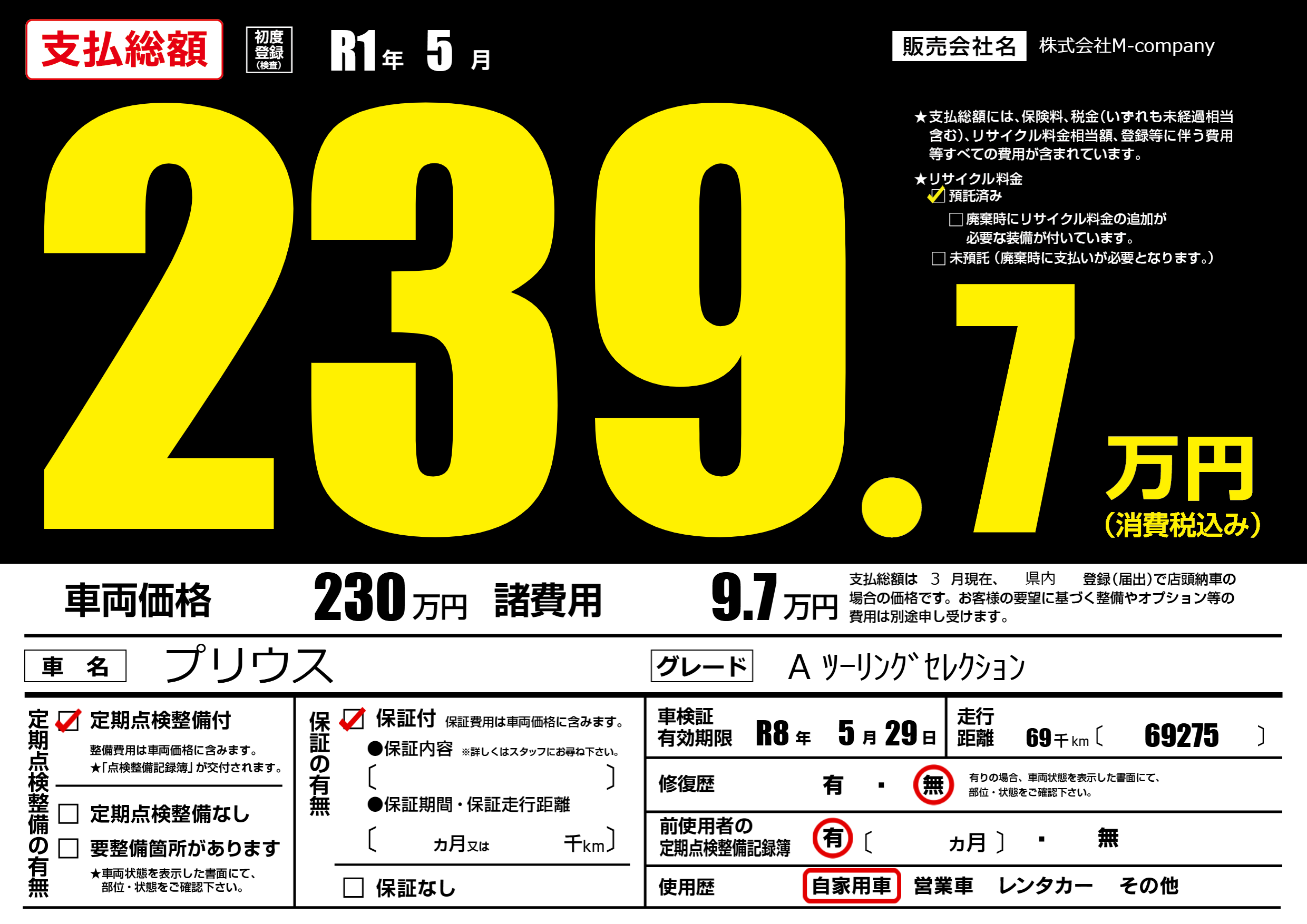 | 車名 | プリウス | グレード ミッション 排気量 |