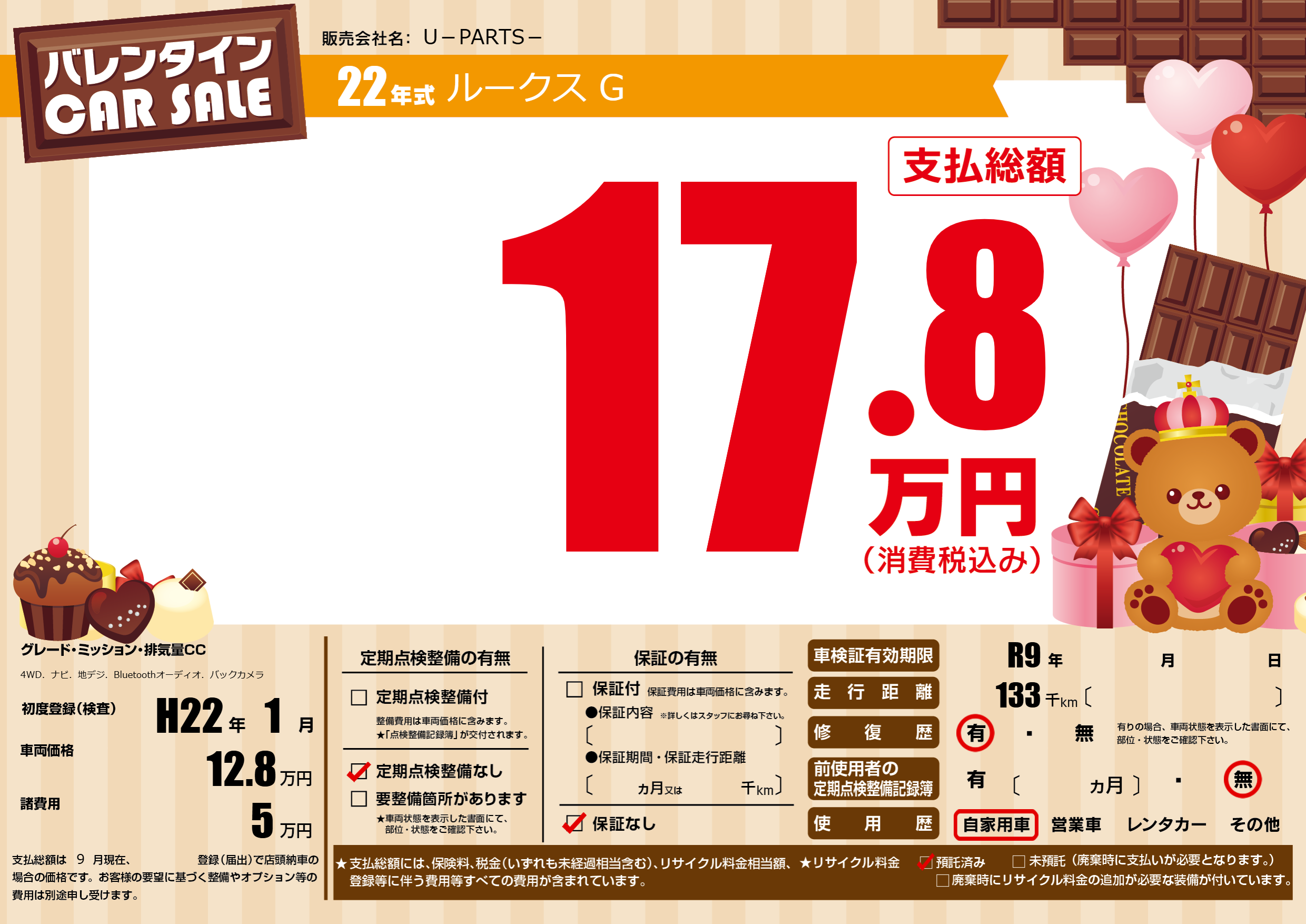 | 走行キロ | 13.3万km | 初年度登録 | H22年1月 |