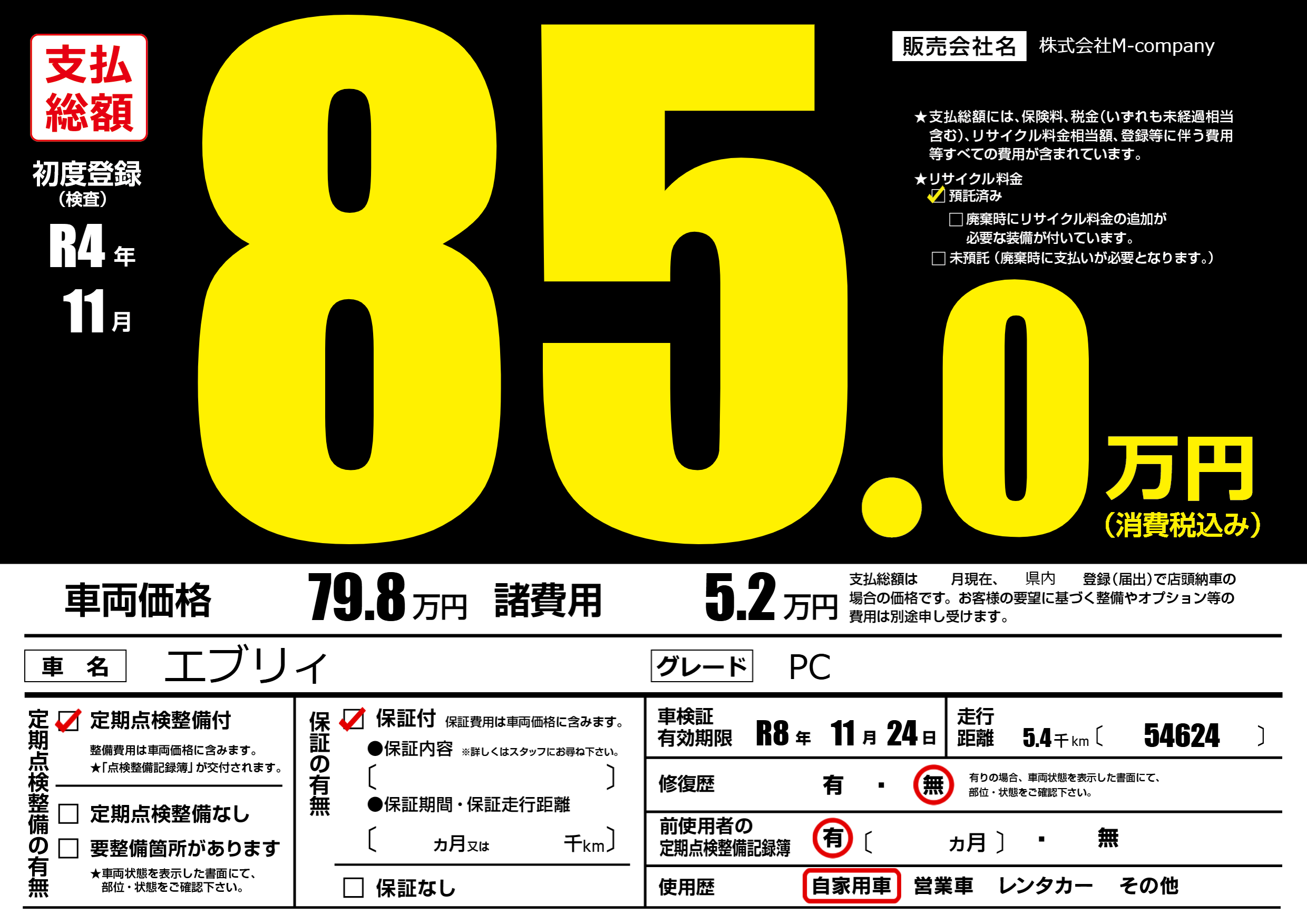 | 車名 | エブリィ | グレード ミッション 排気量 |
