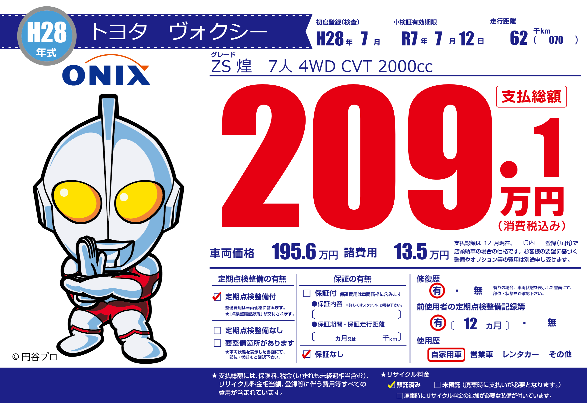| 車名 | トヨタ ヴォクシー | グレード ミッション 排気量 |