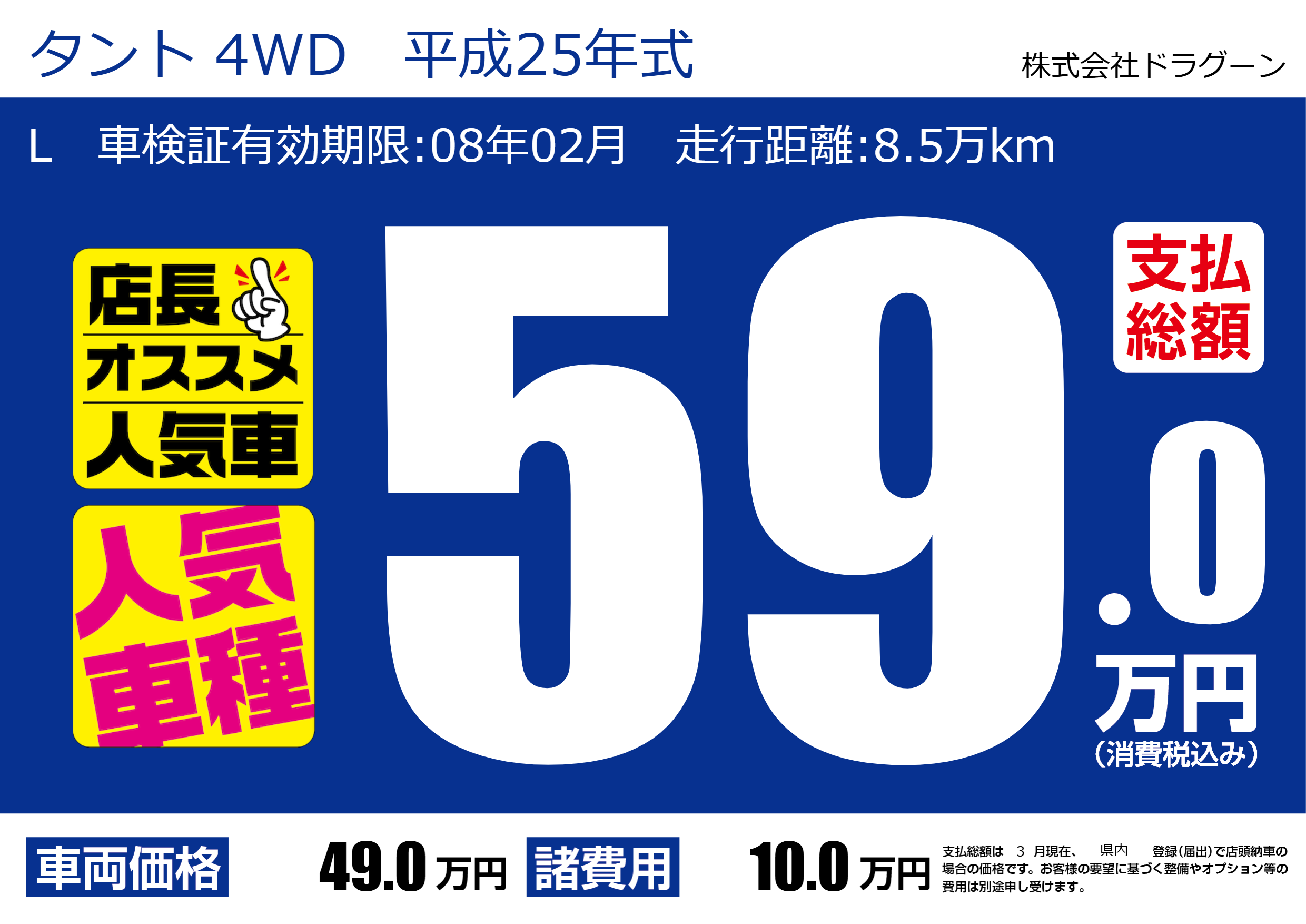 | 車名 | タント 4WD 平成25年式 | グレード ミッション 排気量 |