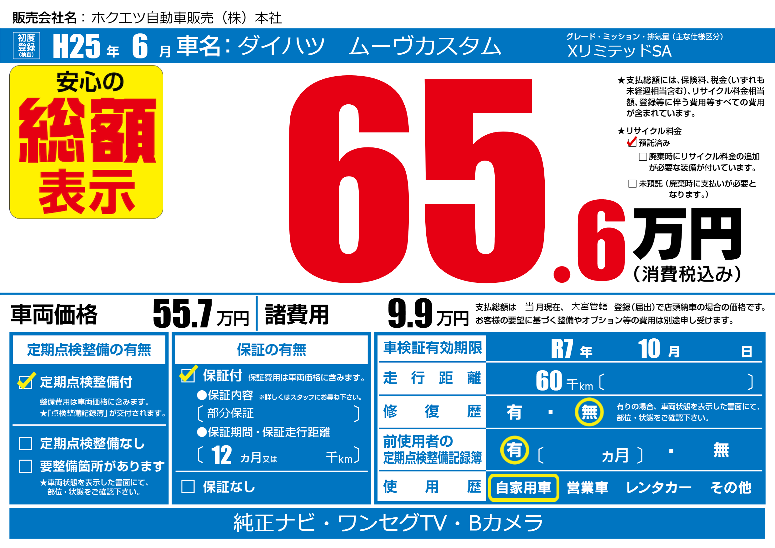 | 走行キロ | 6万km | 初年度登録 | H25年6月 |