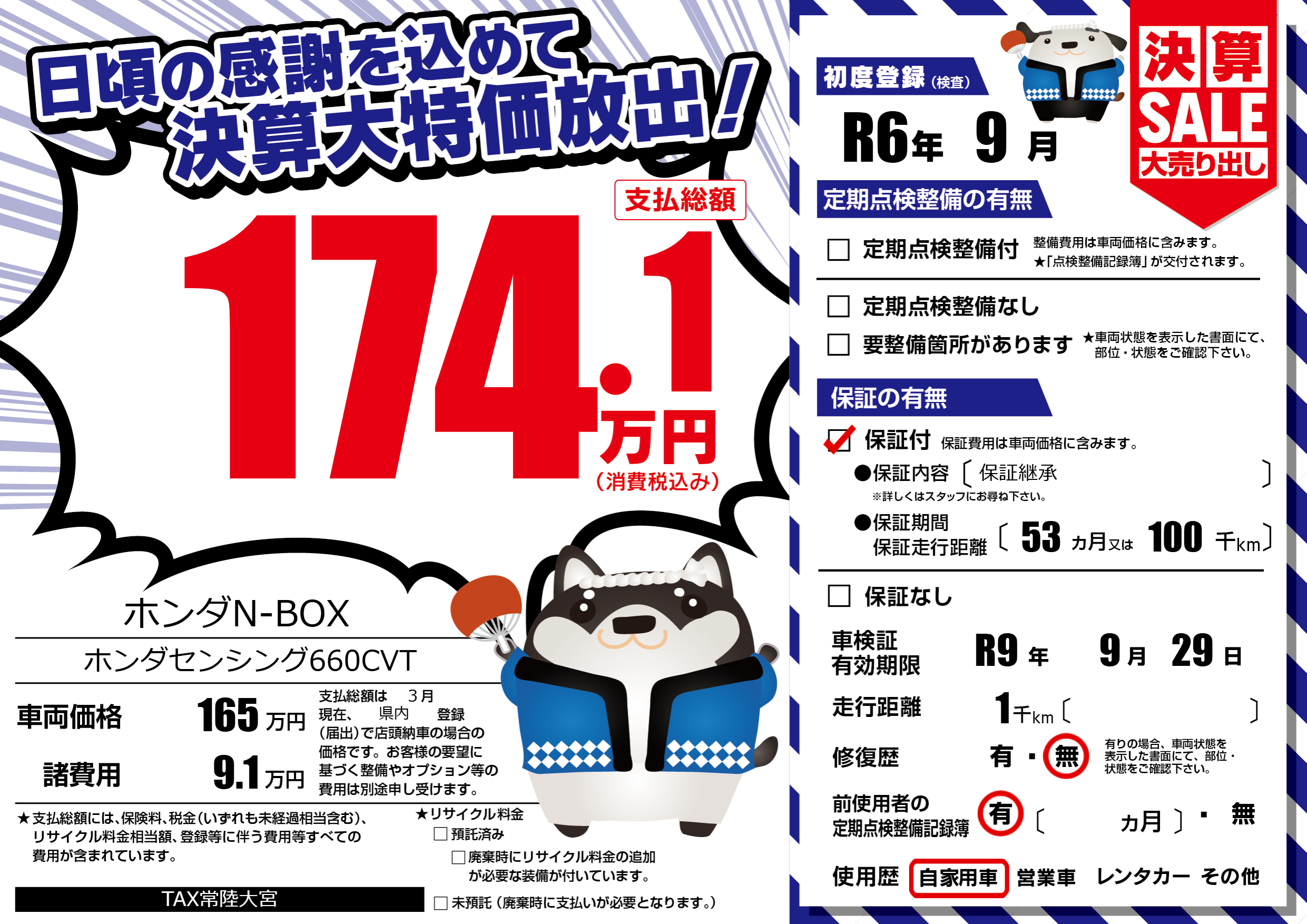 保証付き 保証内容(保証継承) 53ヶ月または(100)千kmまで |