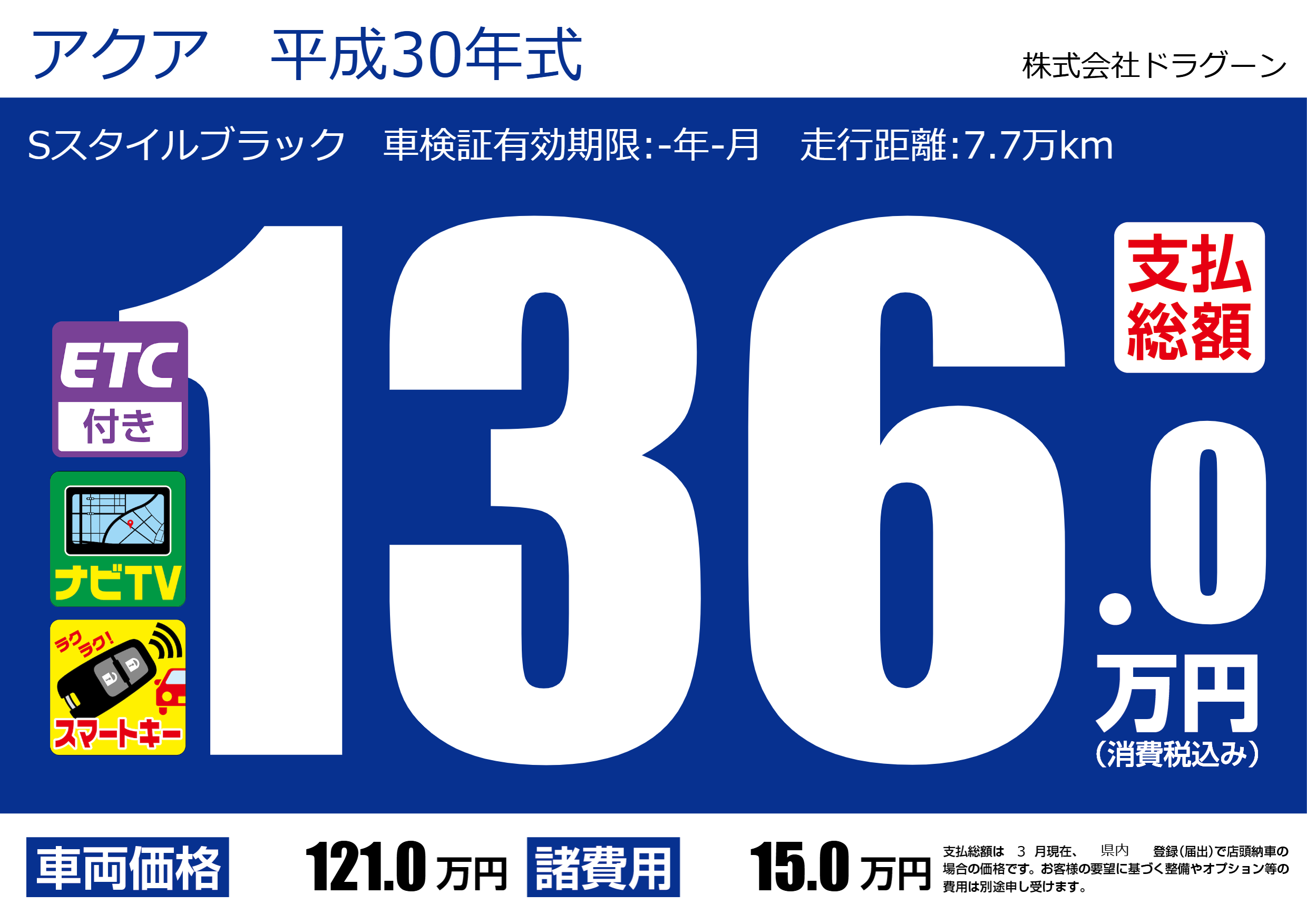 | 車名 | アクア 平成30年式 | グレード ミッション 排気量 |