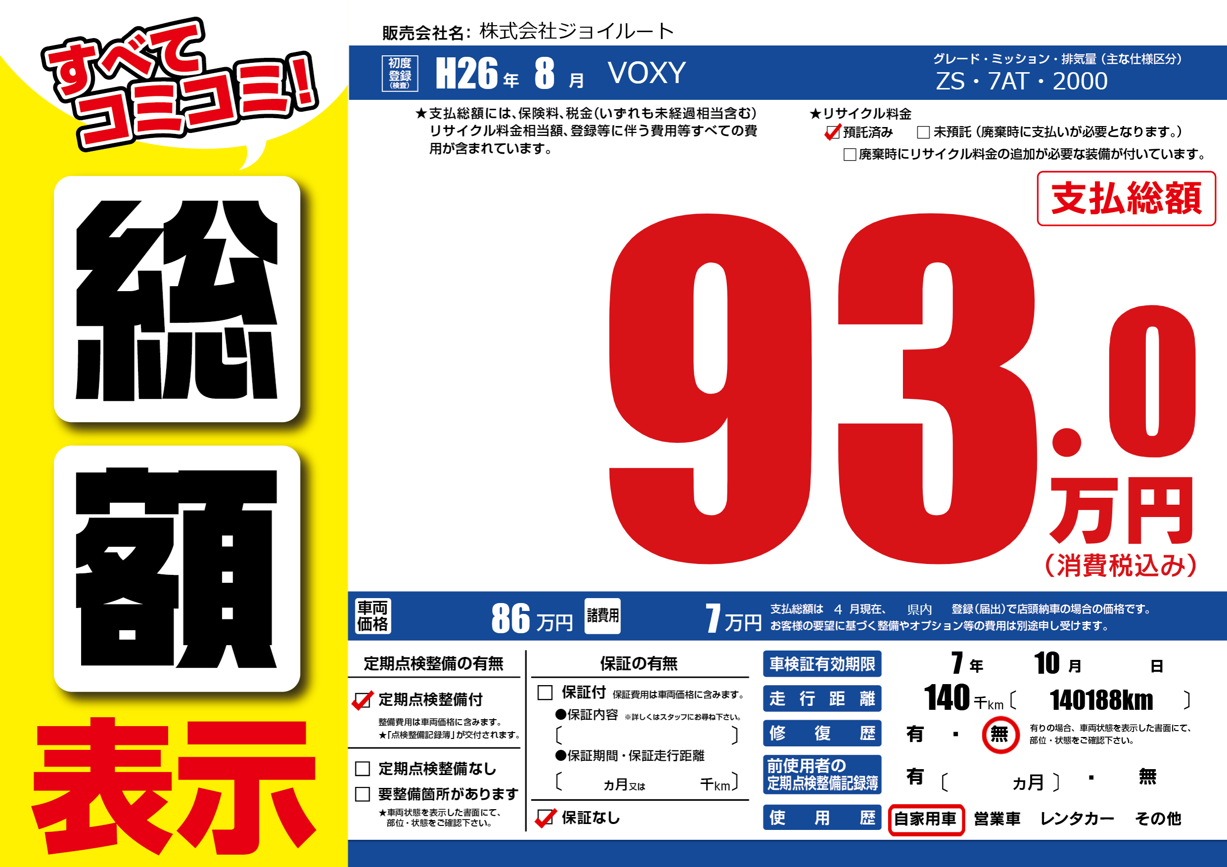 | 車名 | VOXY | グレード ミッション 排気量 |