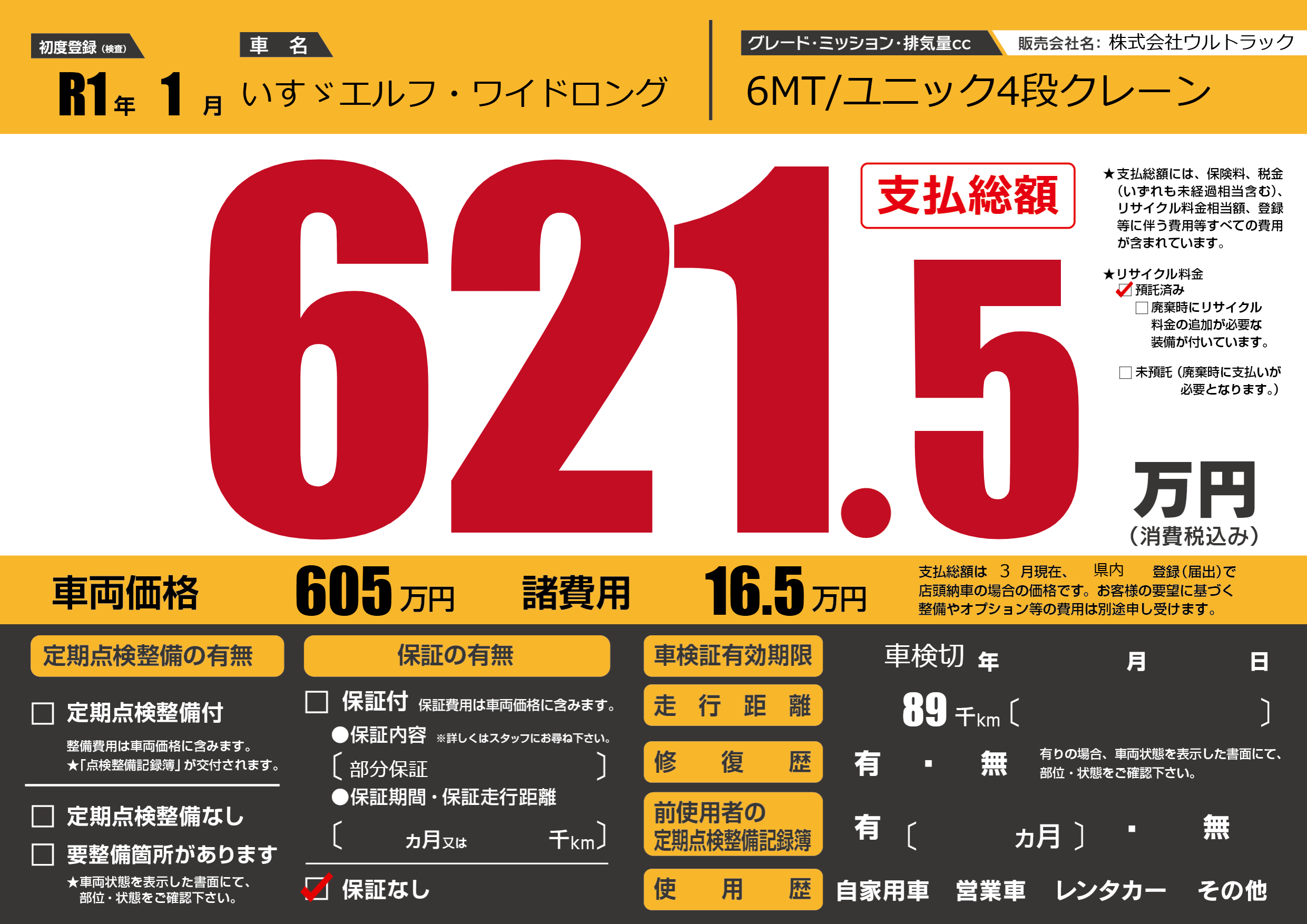 | 車名 | いすゞエルフ・ワイドロング | グレード ミッション 排気量 |