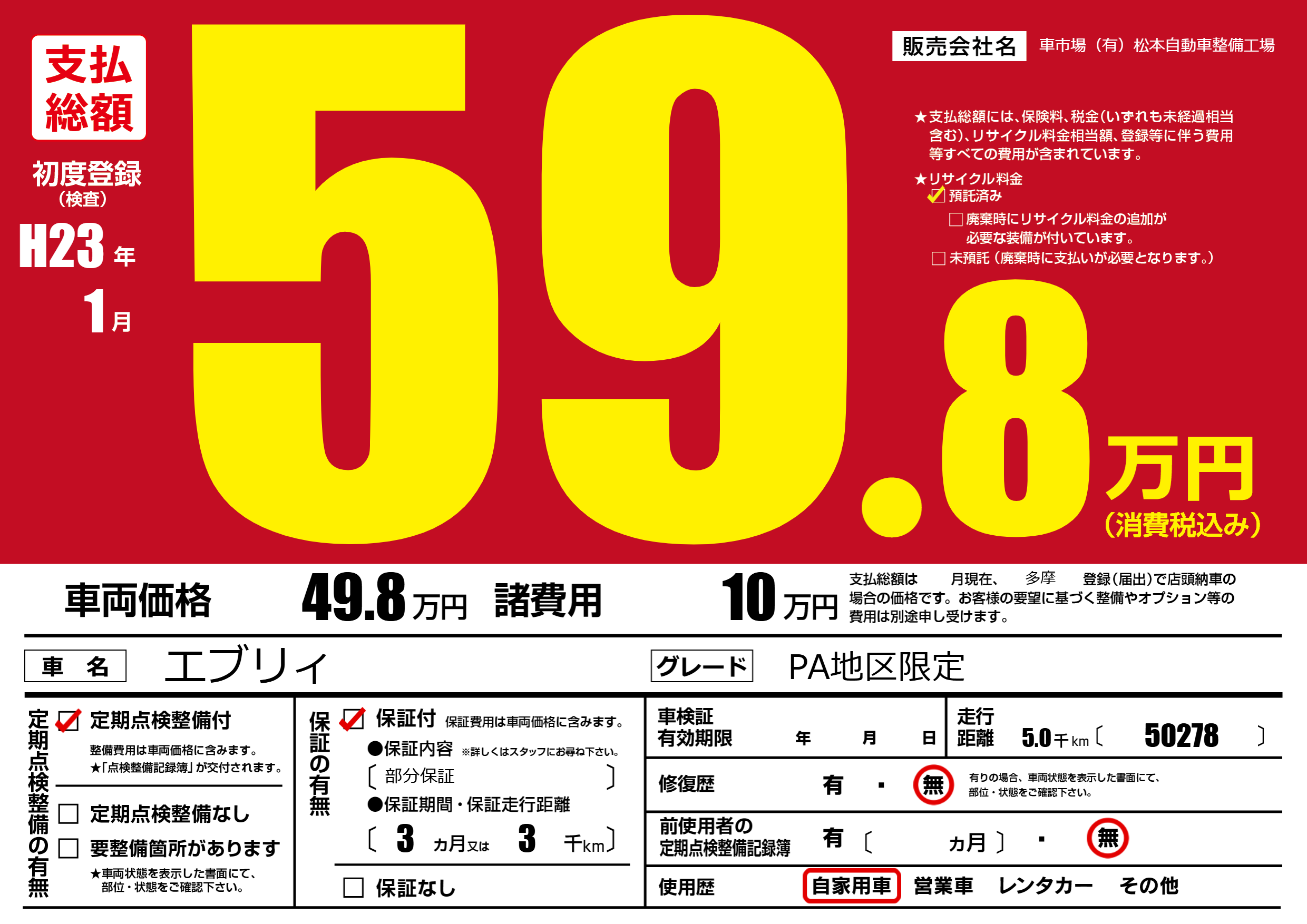 | 走行キロ | 0.5万km | 初年度登録 | H23年1月 |
