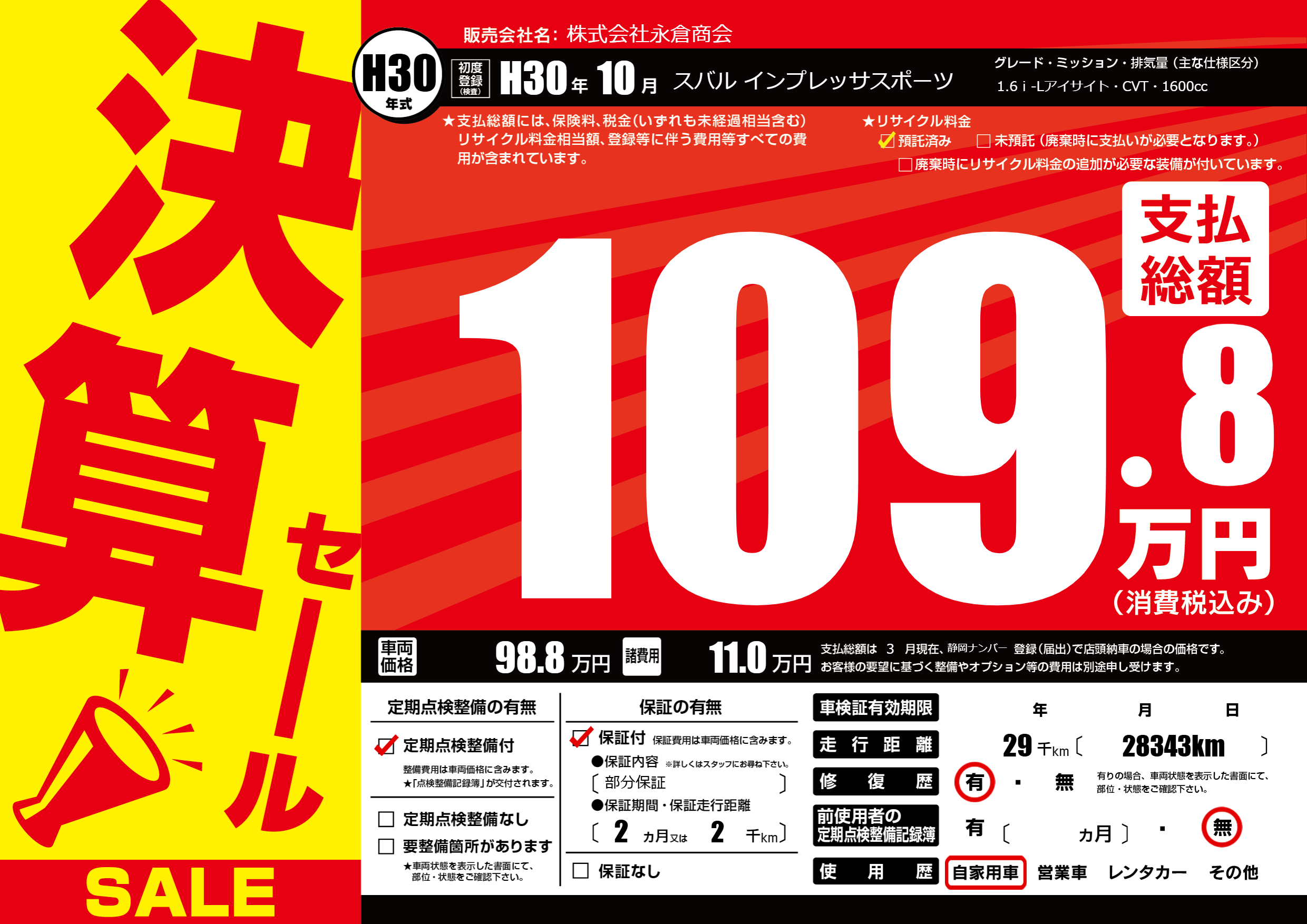 | 車名 | スバル インプレッサスポーツ | グレード ミッション 排気量 |