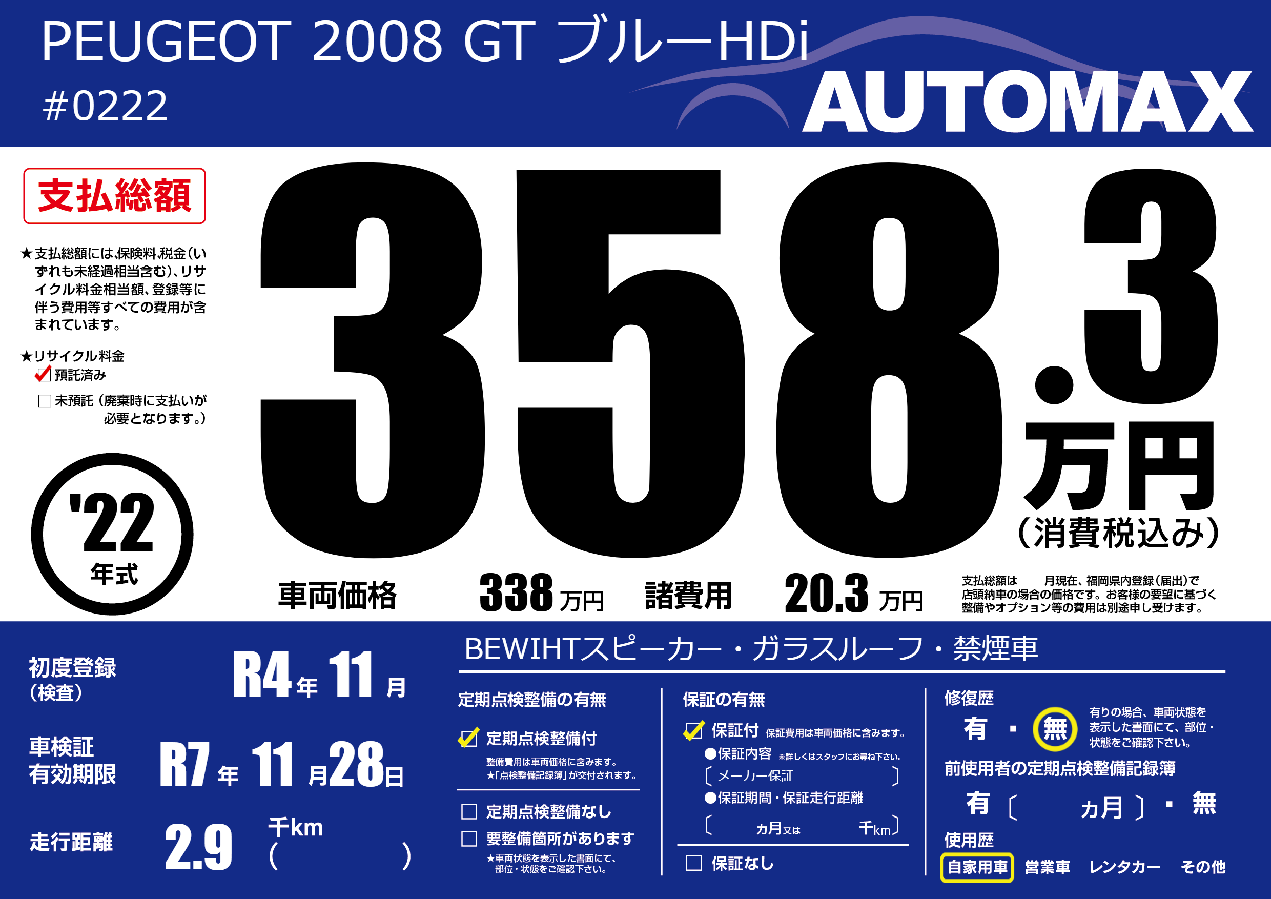| 車名 | PEUGEOT 2008 GT ブルーHDi | グレード ミッション 排気量 |