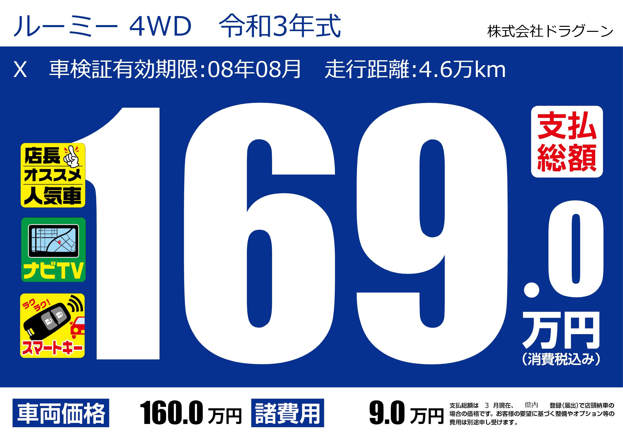 | 車名 | ルーミー 4WD 令和3年式 | グレード ミッション 排気量 |
