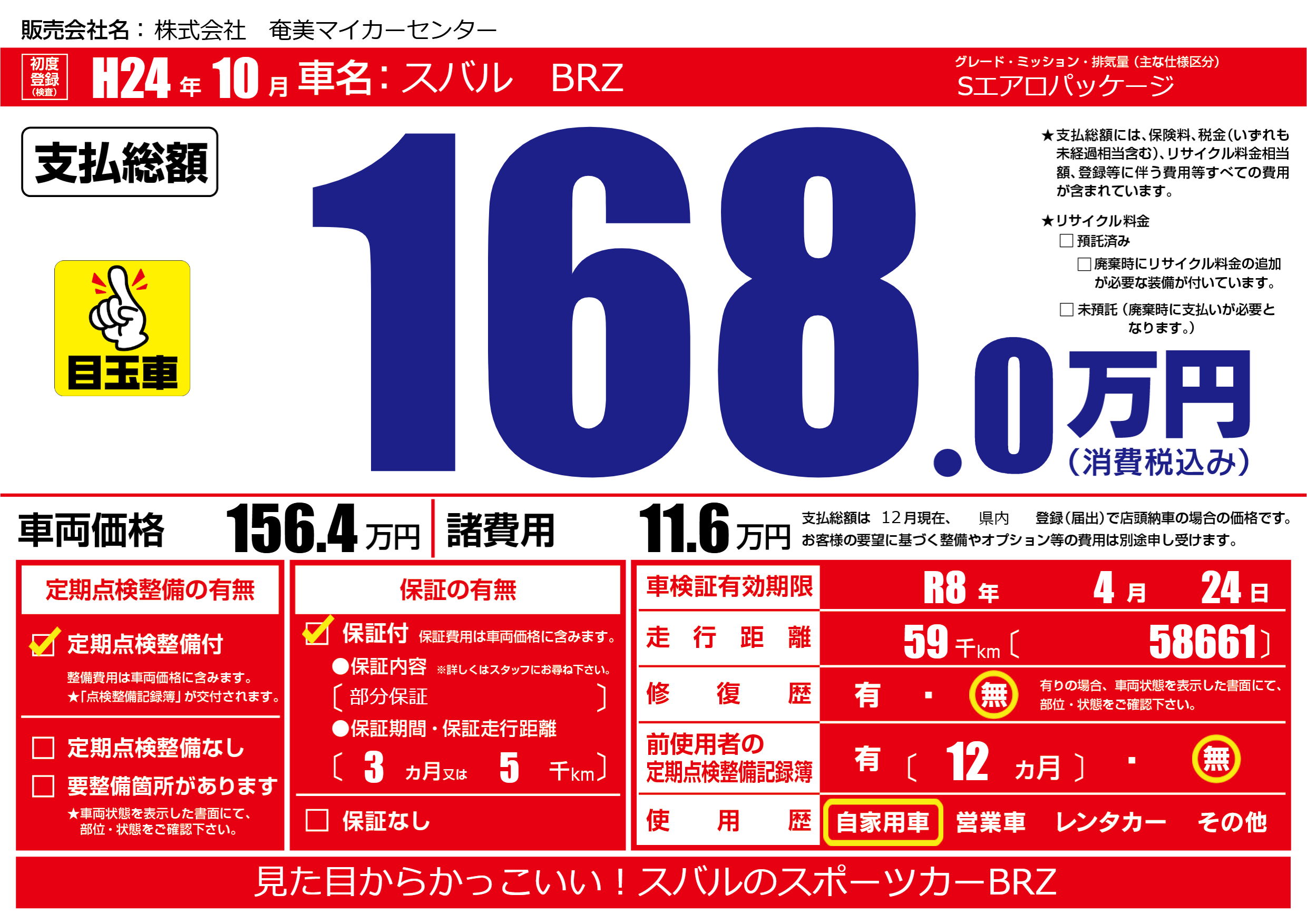 | 車名 | スバル BRZ | グレード ミッション 排気量 |