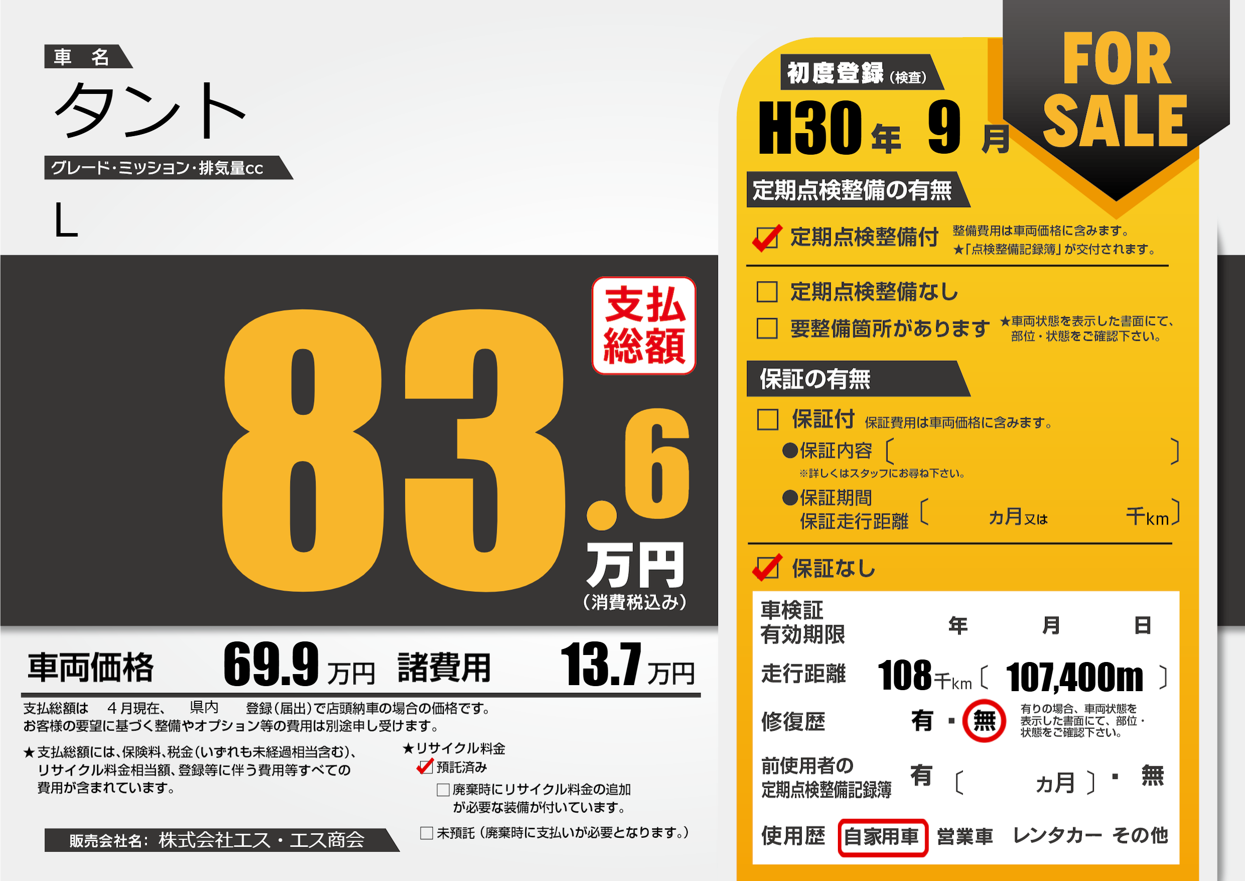 | 走行キロ | 10.8万km | 初年度登録 | H30年9月 |