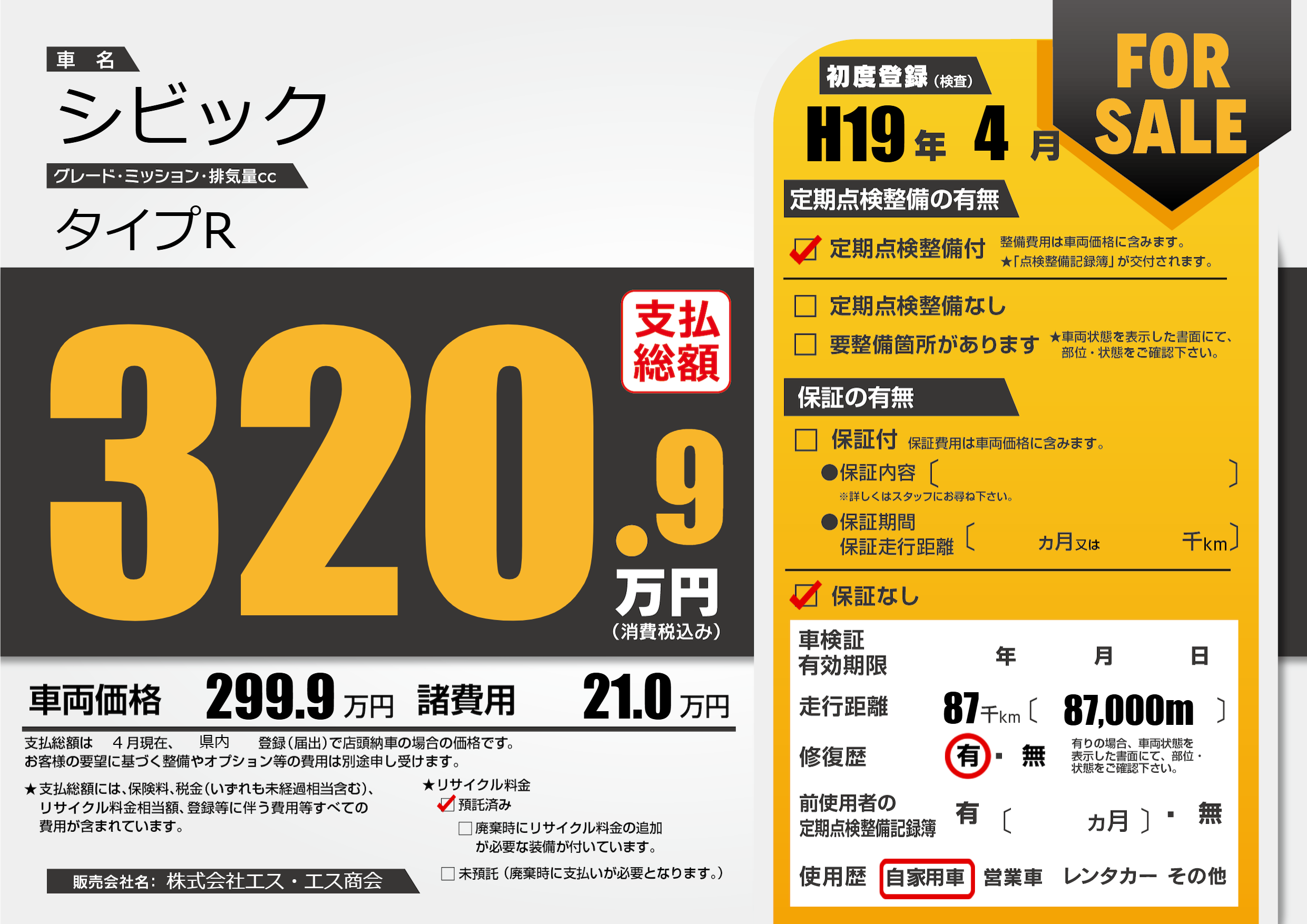 | 走行キロ | 8.7万km | 初年度登録 | H19年4月 |