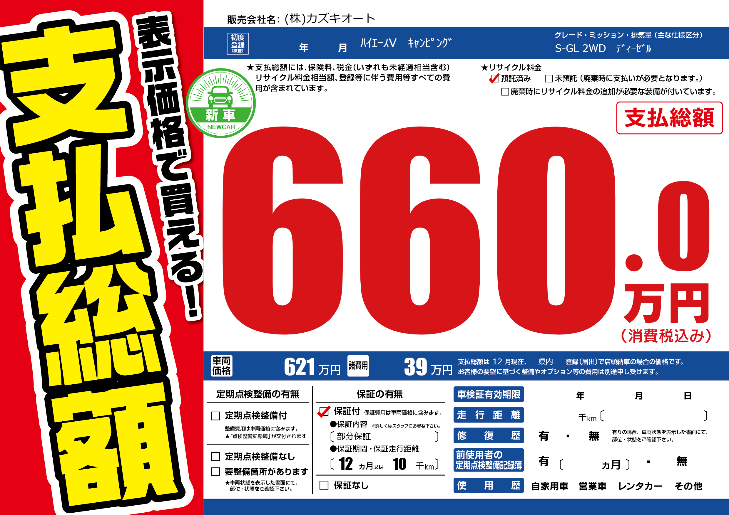 | 車名 | ハイエースV キャンピング | グレード ミッション 排気量 |