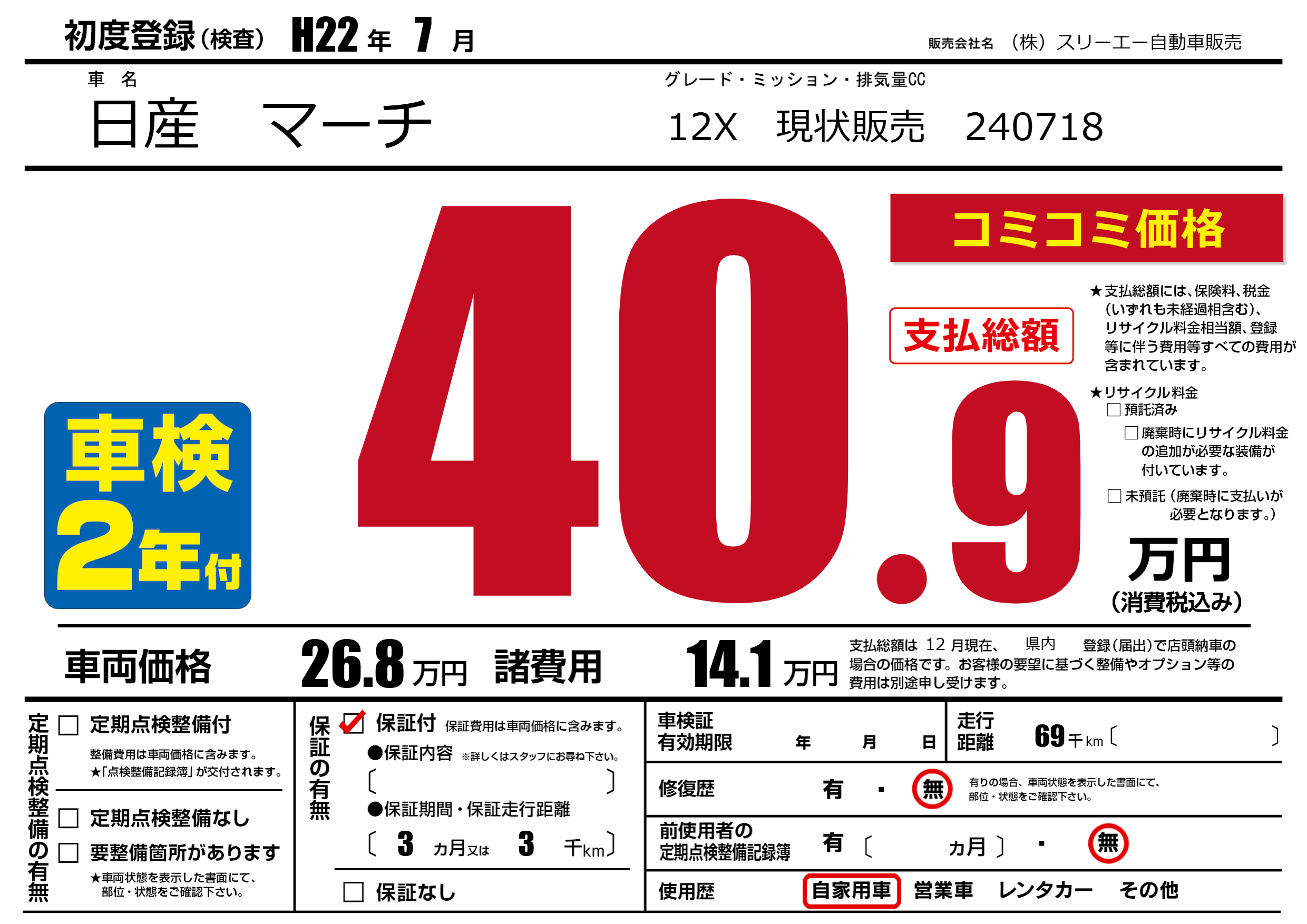 | 車名 | 日産 マーチ | グレード ミッション 排気量 |