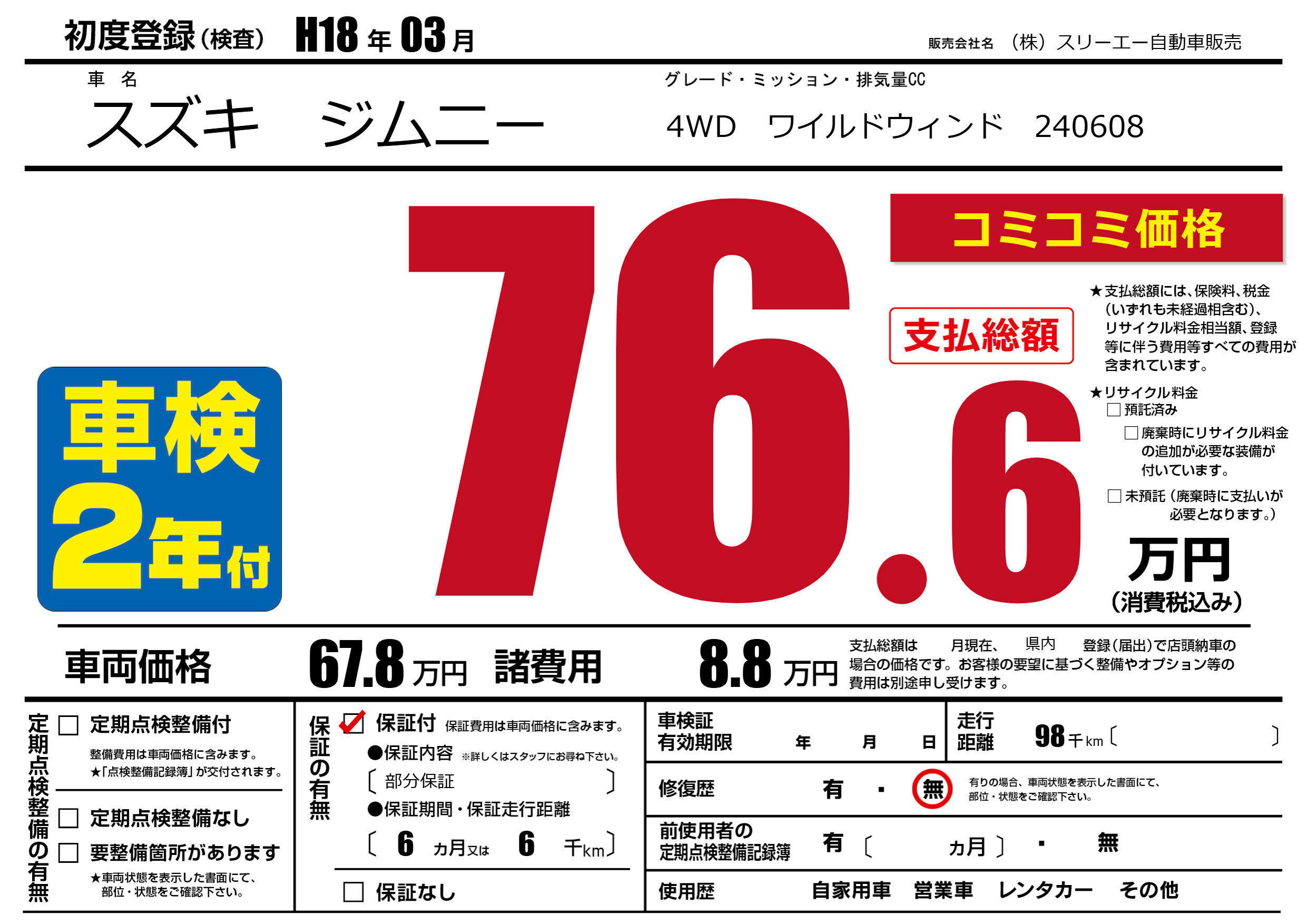 | 車名 | スズキ ジムニー | グレード ミッション 排気量 |