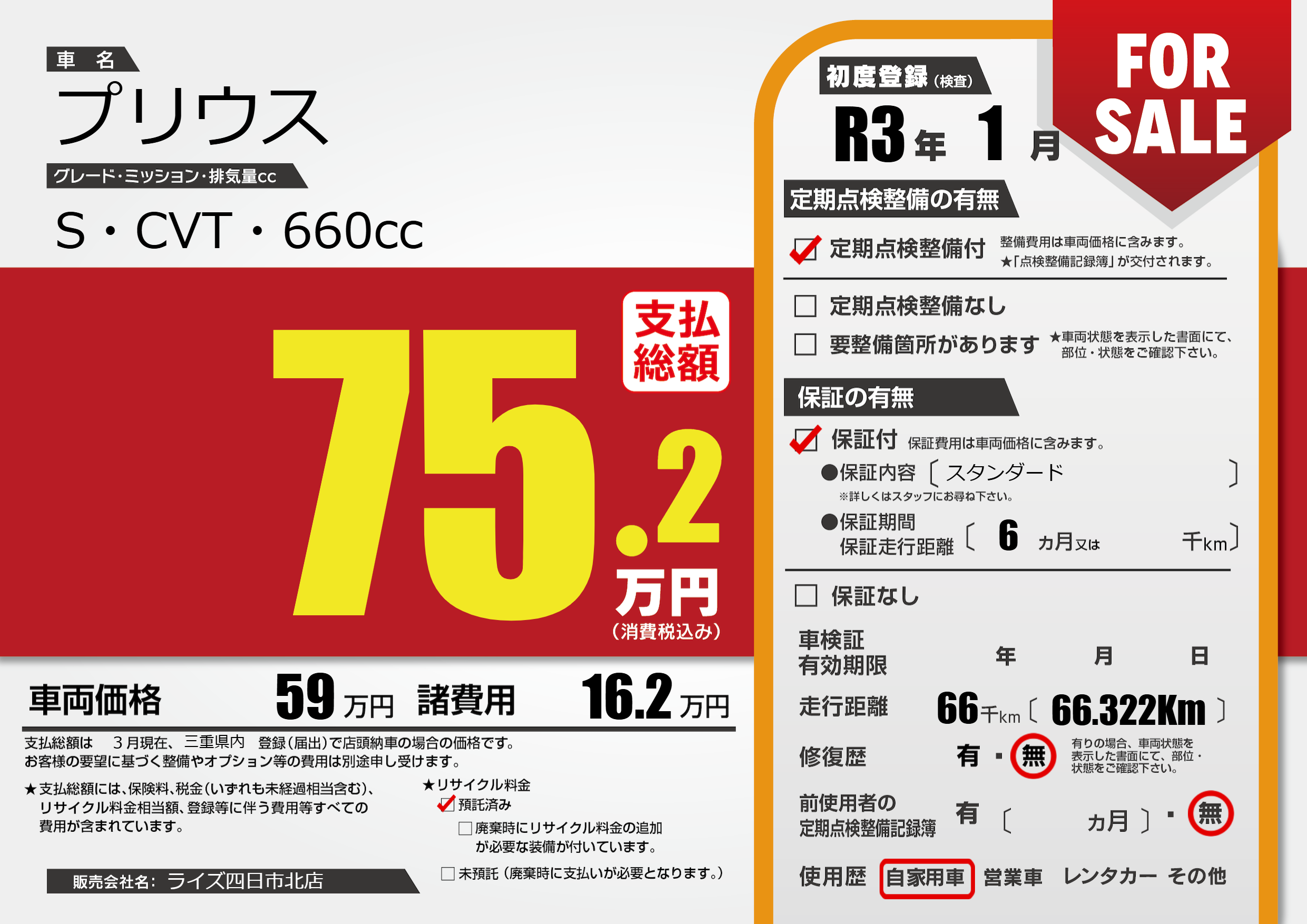| 車名 | プリウス | グレード ミッション 排気量 |