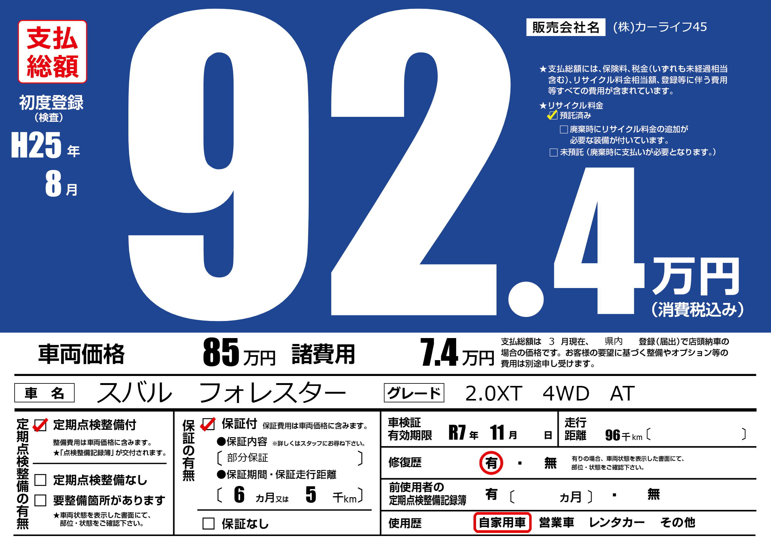 | 車名 | スバル フォレスター | グレード ミッション 排気量 |