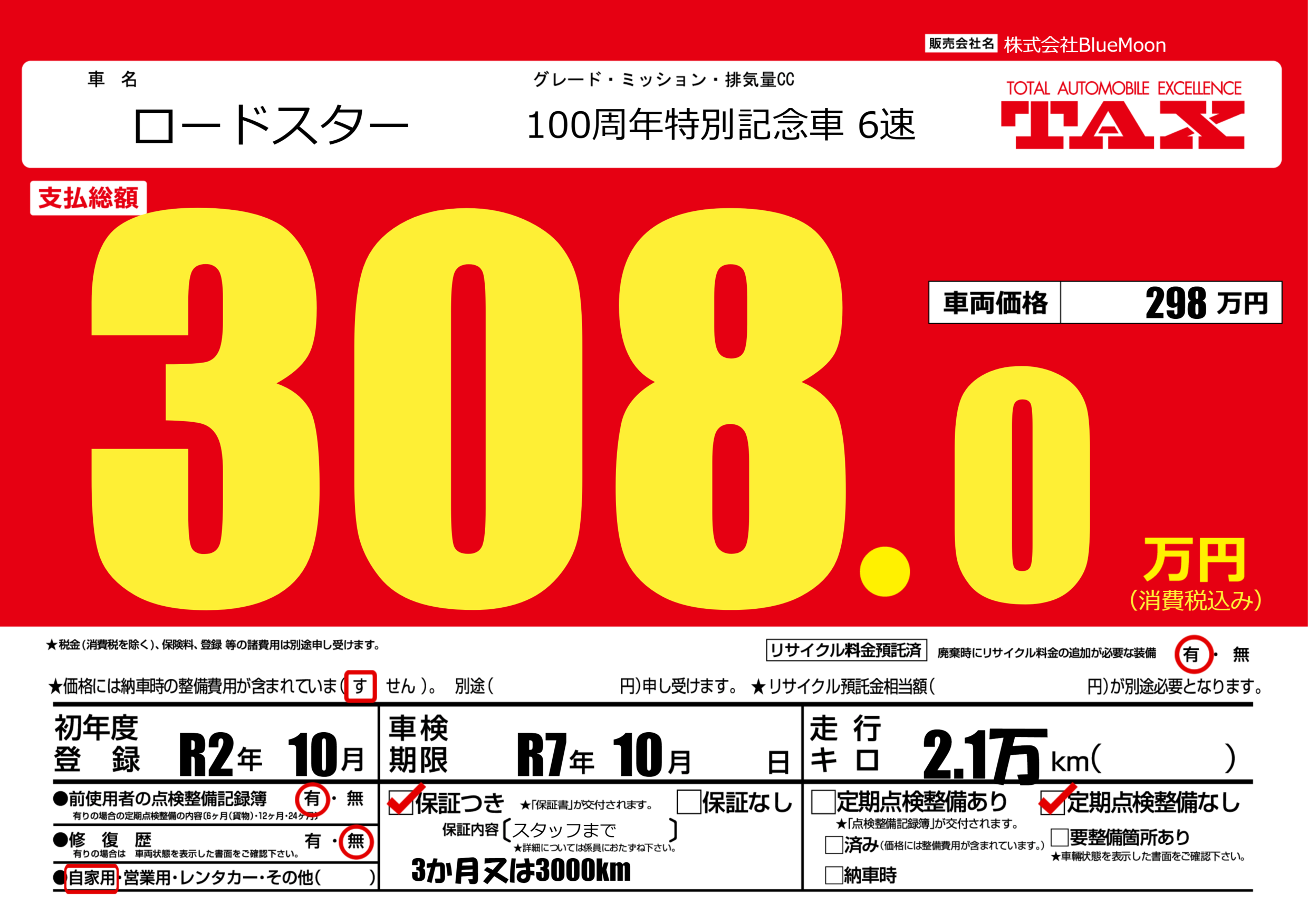 保証付き 保証内容(スタッフまで) ---ヶ月または()千kmまで |