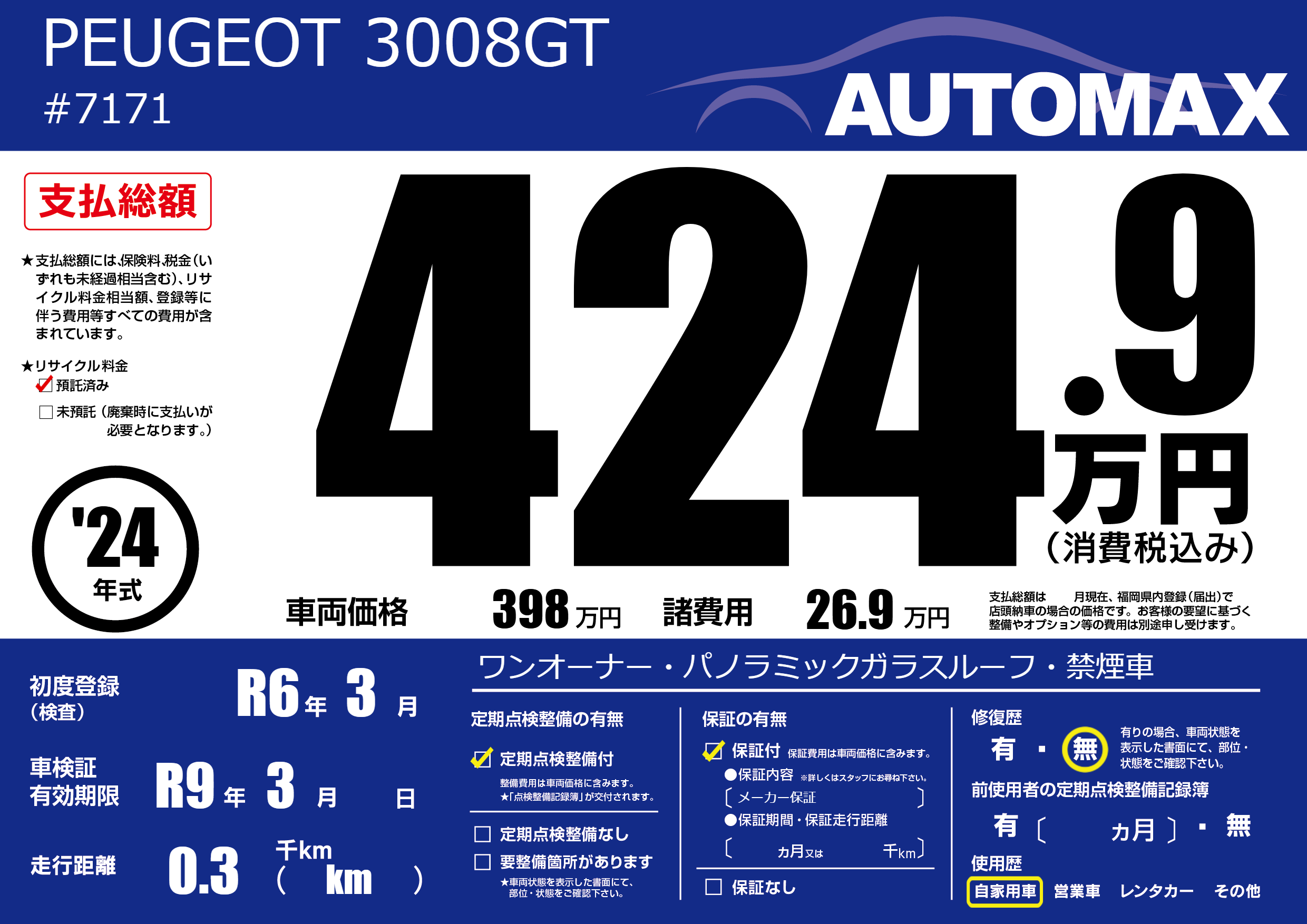 | 車名 | PEUGEOT 3008GT | グレード ミッション 排気量 |