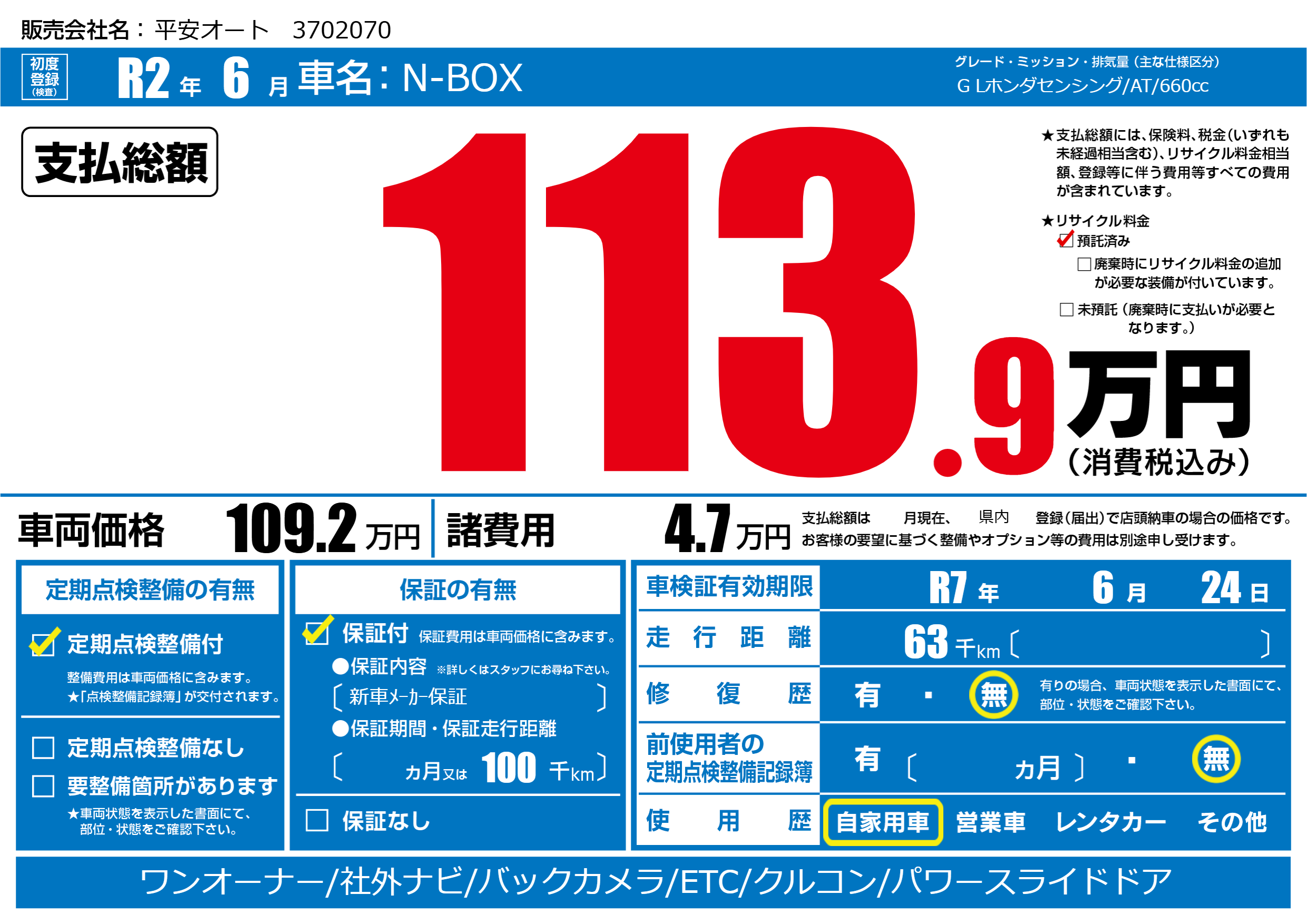 なし | 車検制限 | R7年6月24月 |