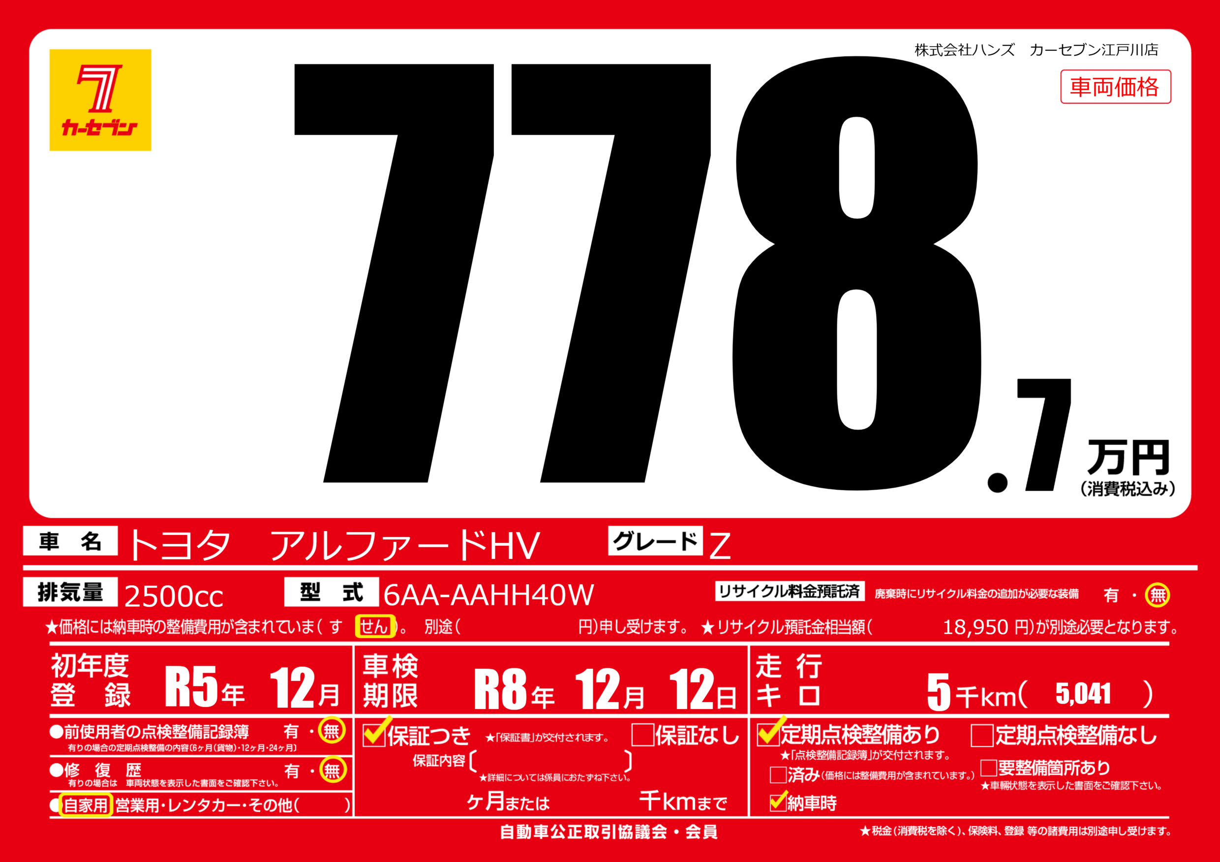 なし | 車検制限 | R8年12月12月 |