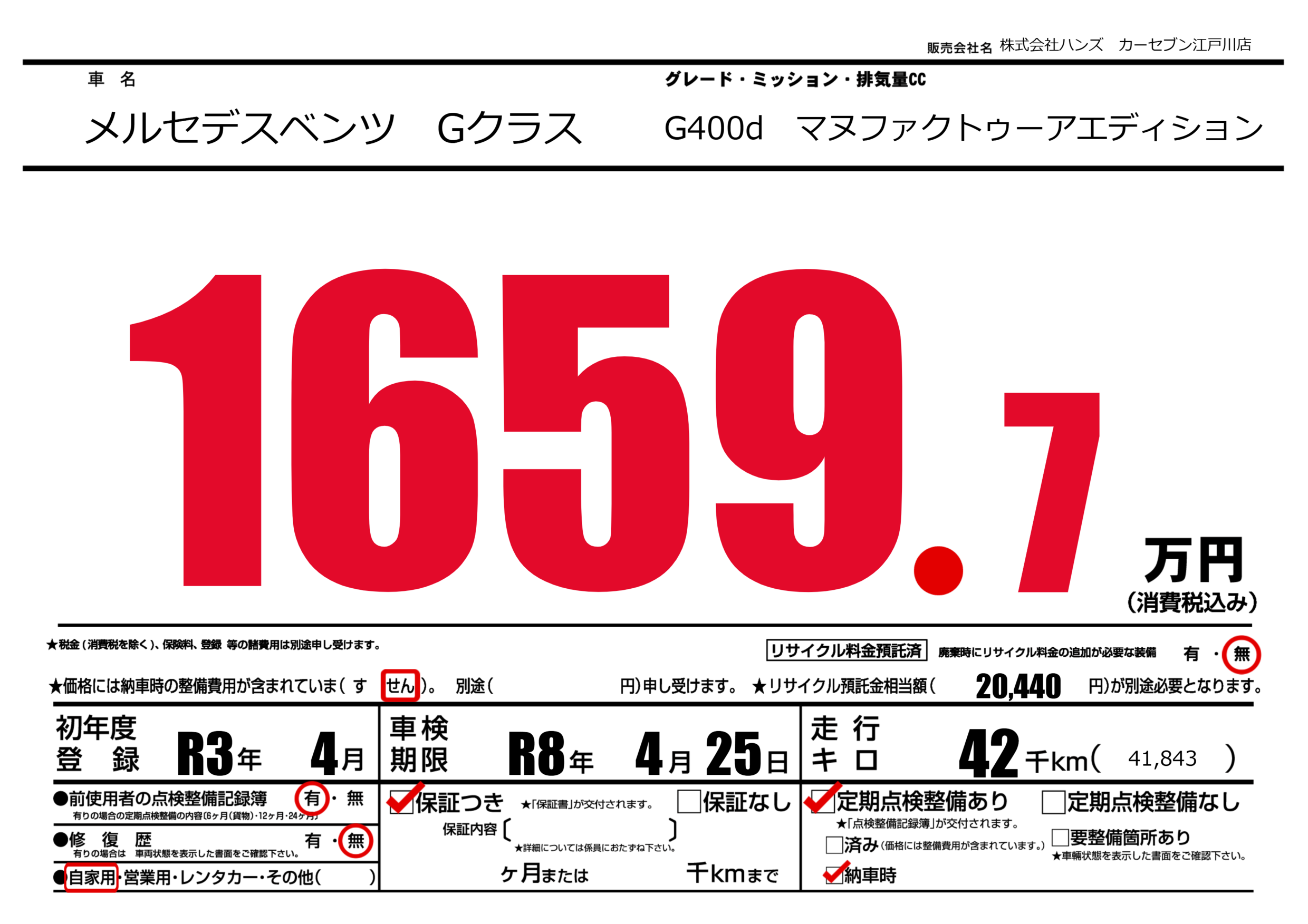 | 車名 | メルセデスベンツ Gクラス | グレード ミッション 排気量 |