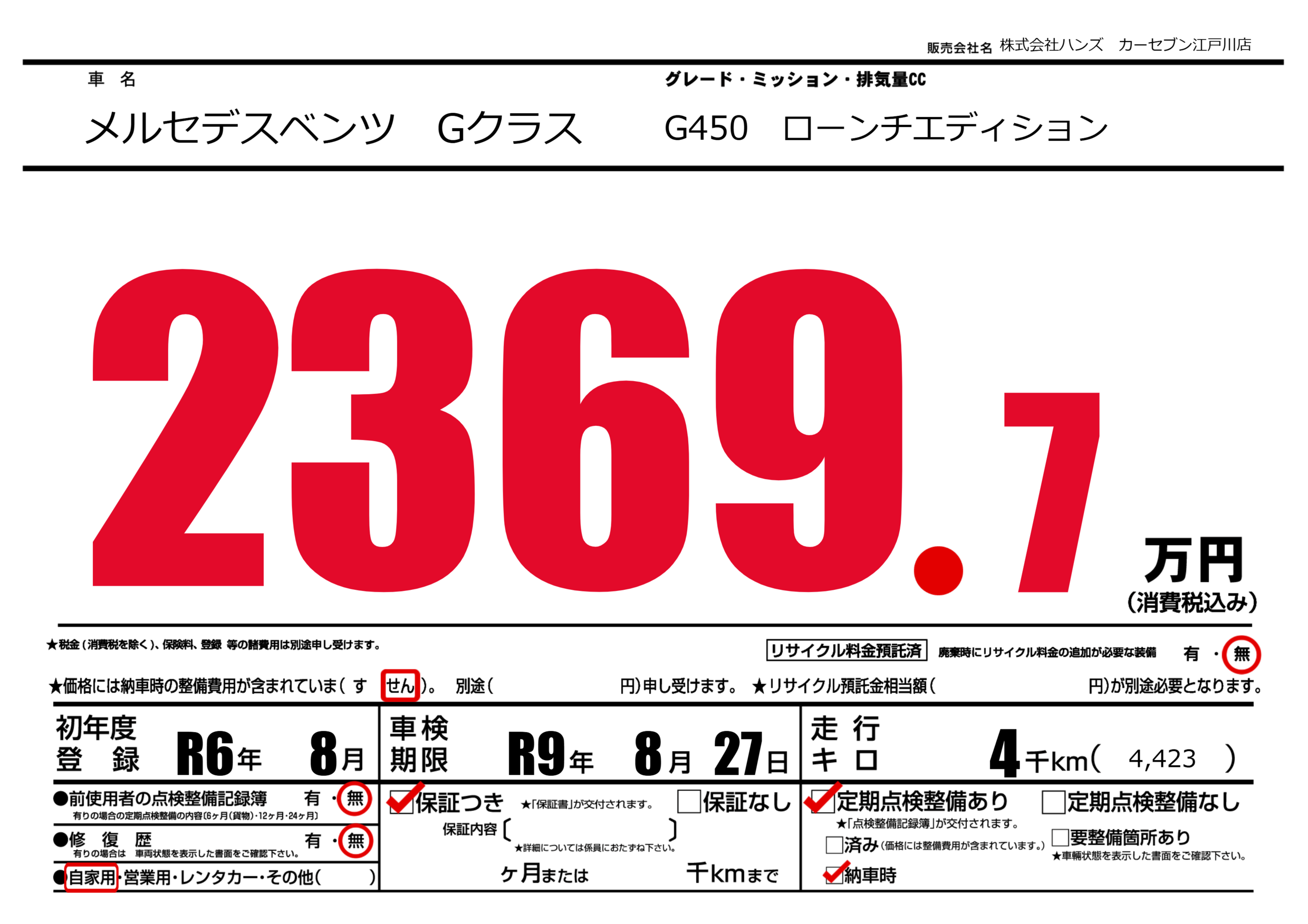 | 車名 | メルセデスベンツ Gクラス | グレード ミッション 排気量 |