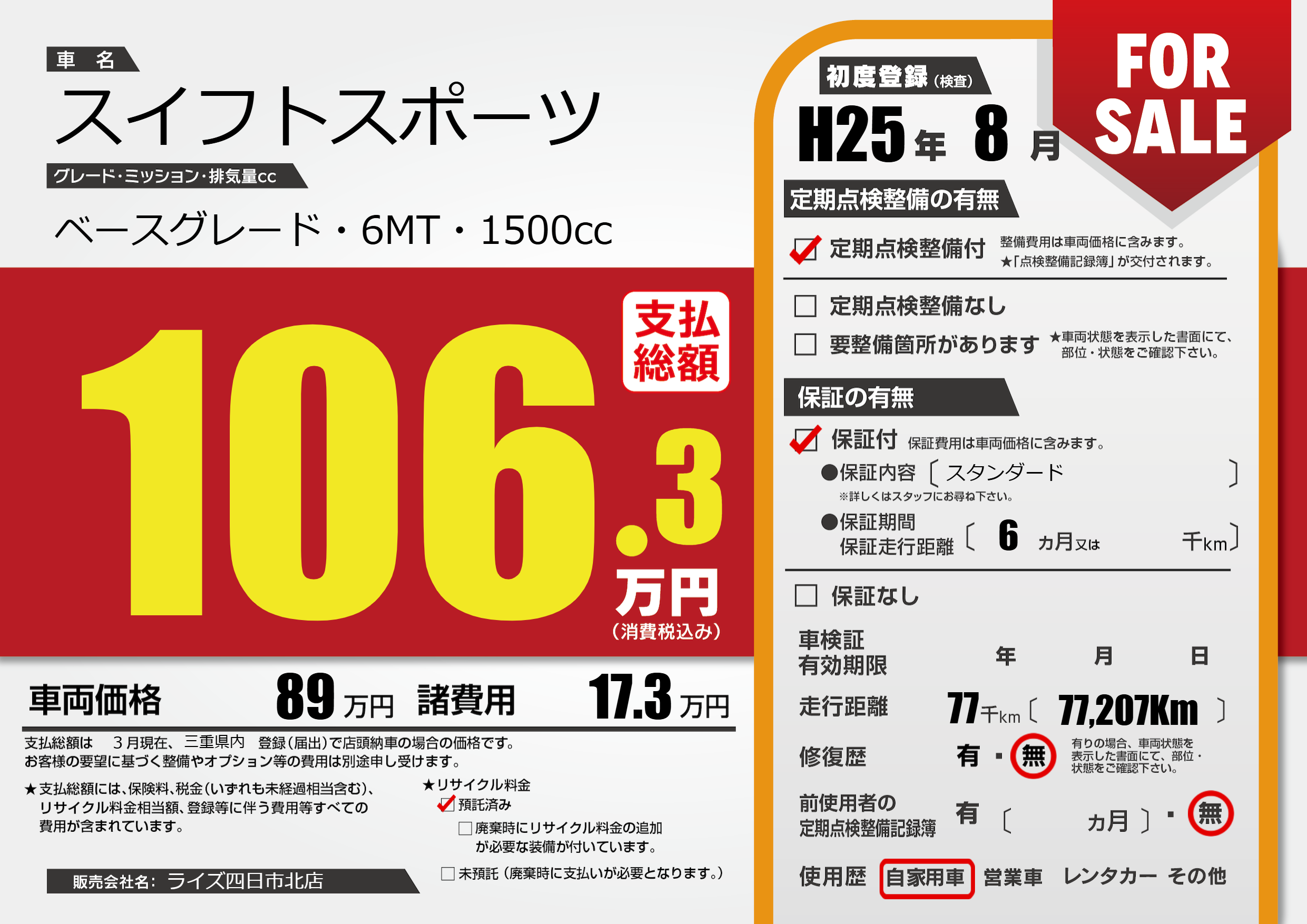| 車名 | スイフトスポーツ | グレード ミッション 排気量 |