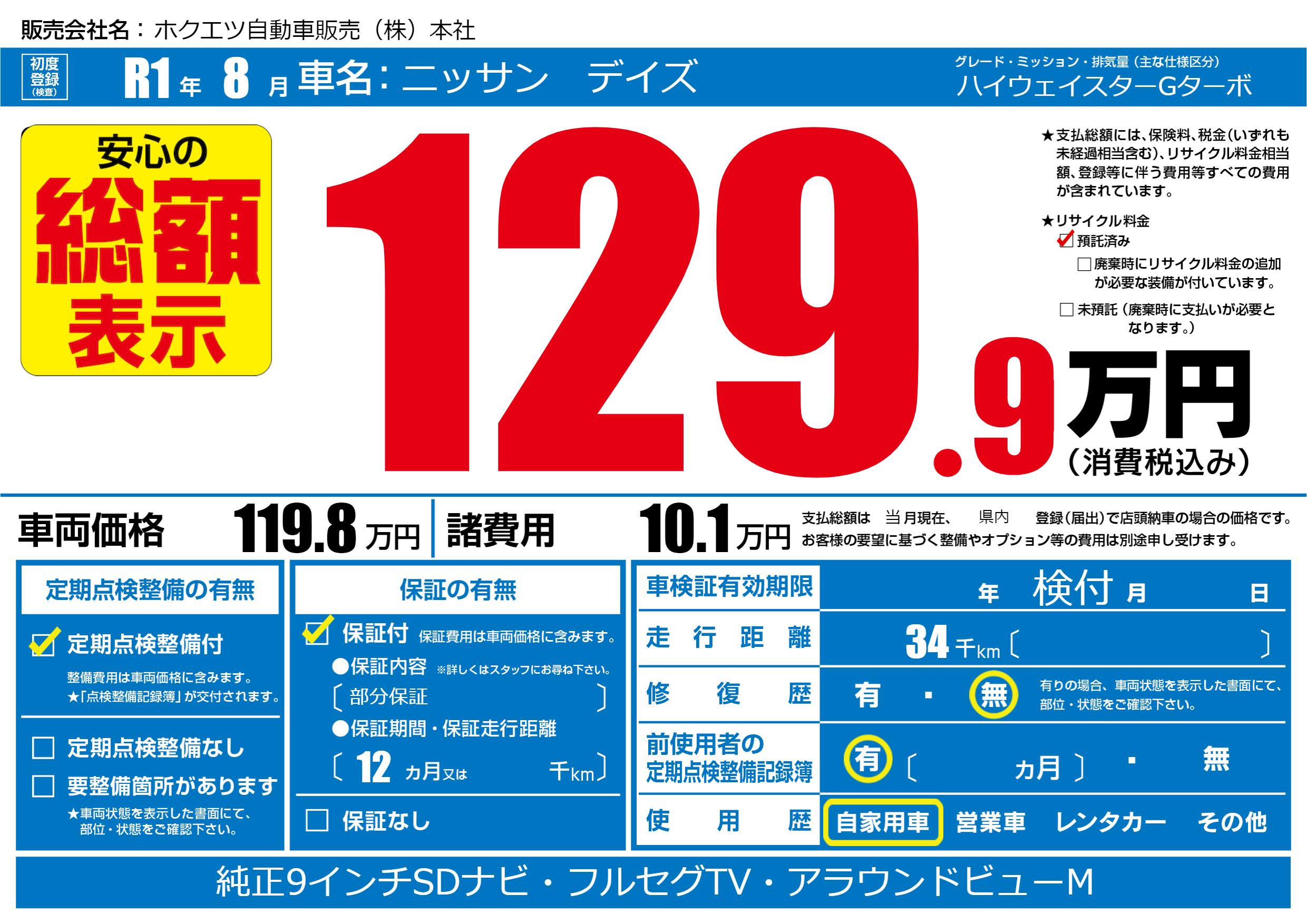 | 車名 | ニッサン デイズ | グレード ミッション 排気量 |