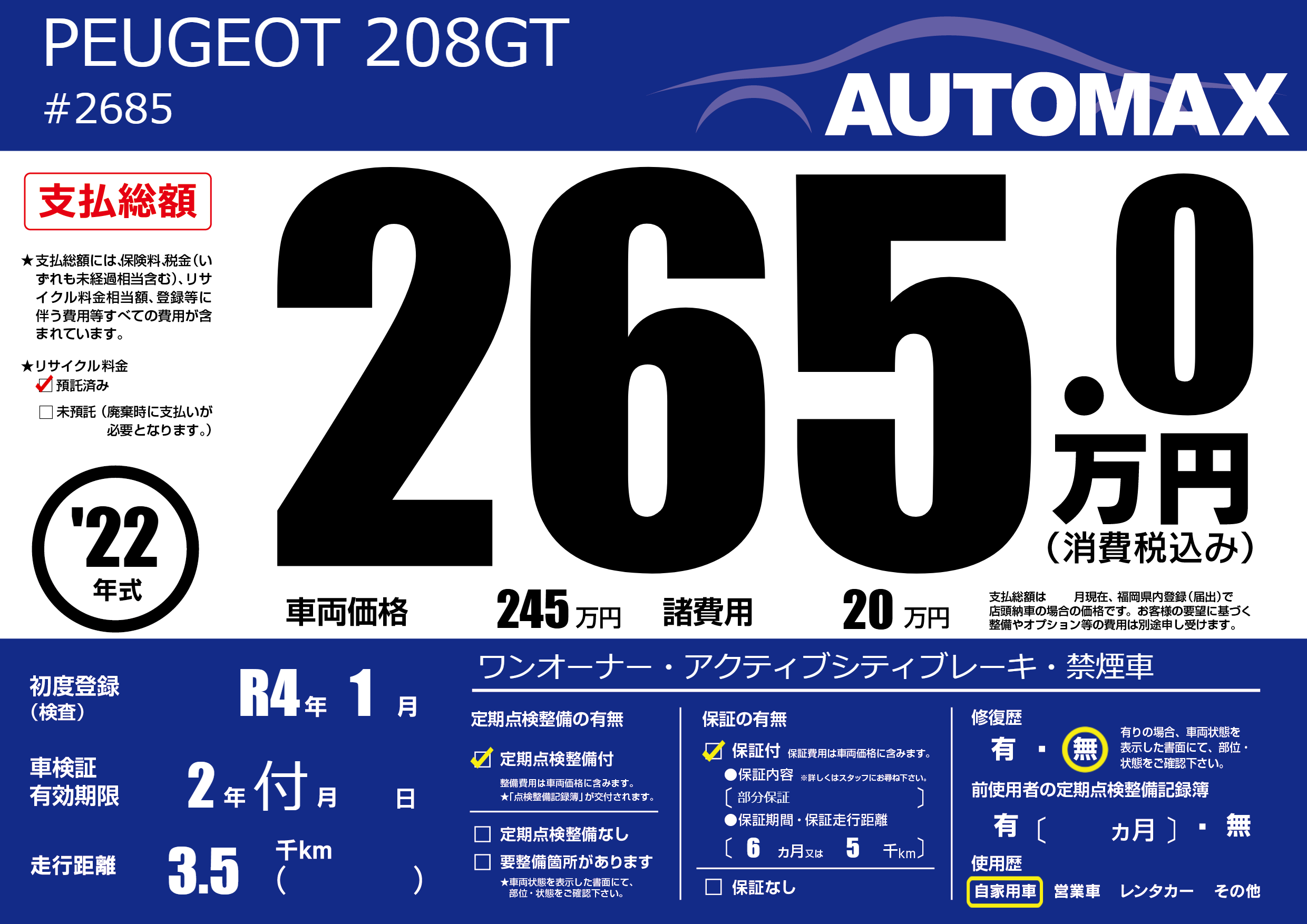| 車名 | PEUGEOT 208GT | グレード ミッション 排気量 |