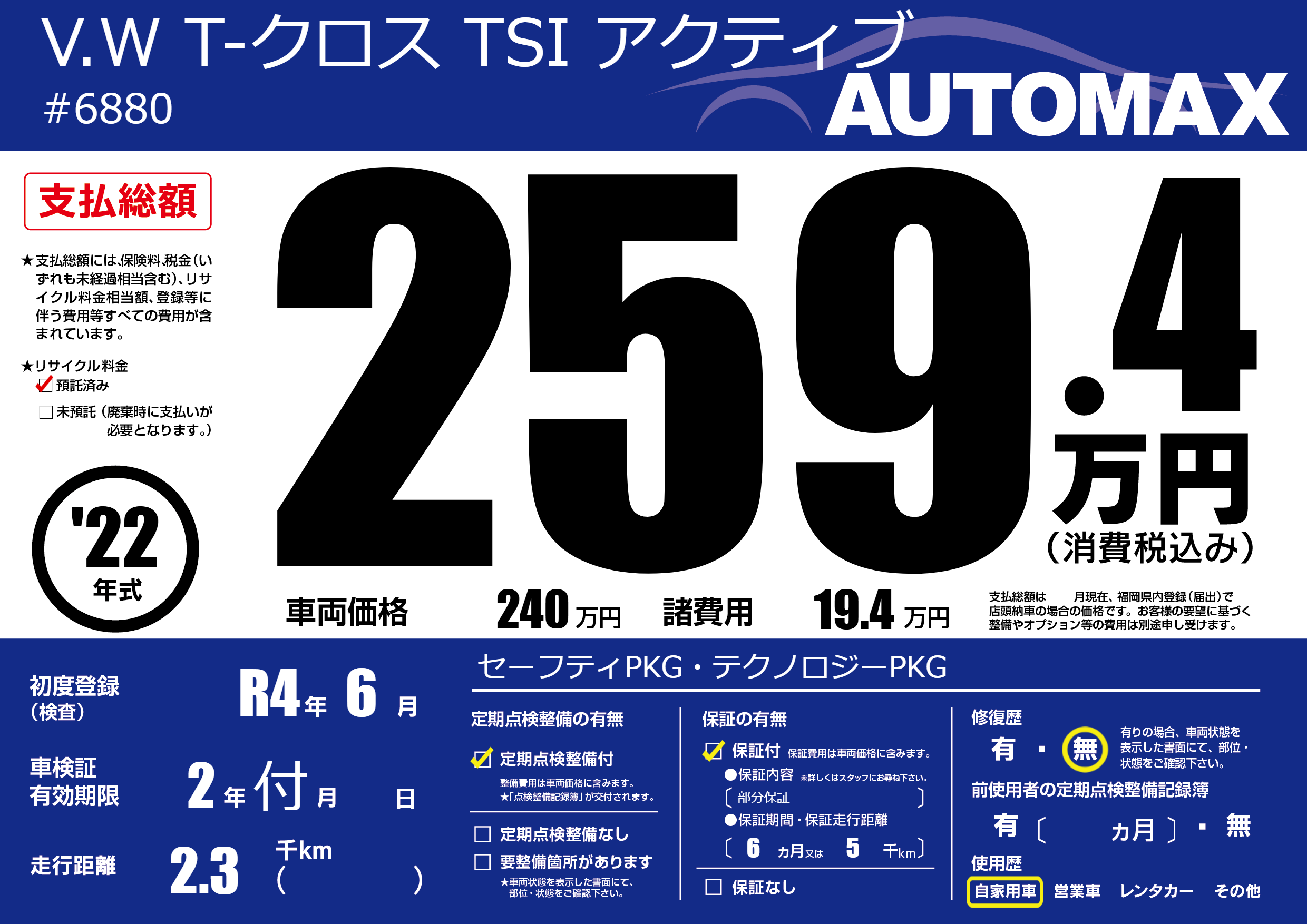 | 走行キロ | 0.2万km | 初年度登録 | R4年6月 |