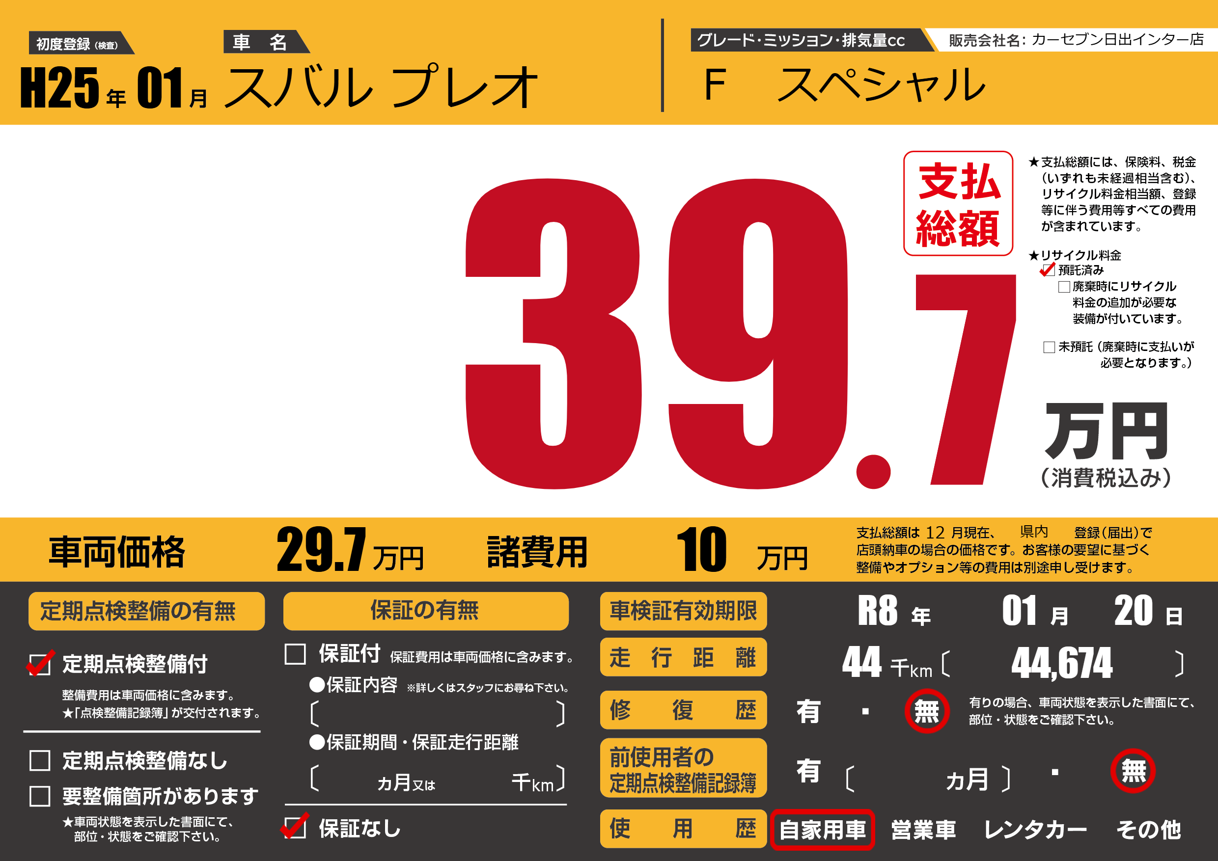 | 車名 | スバル プレオ | グレード ミッション 排気量 |
