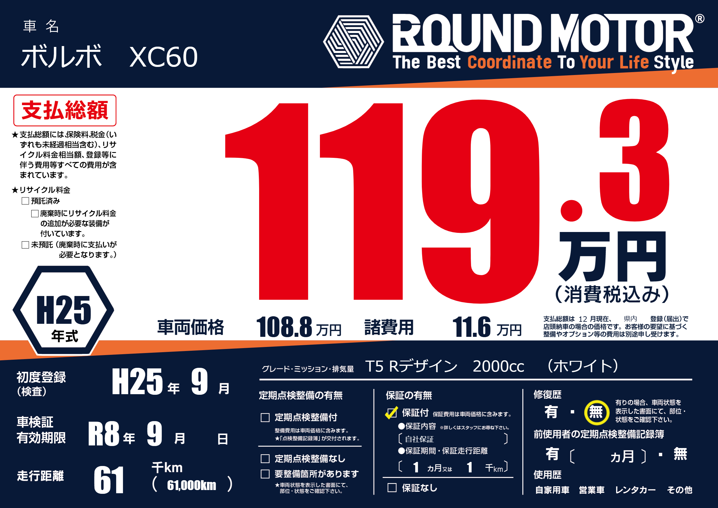 | 車名 | ボルボ XC60 | グレード ミッション 排気量 |